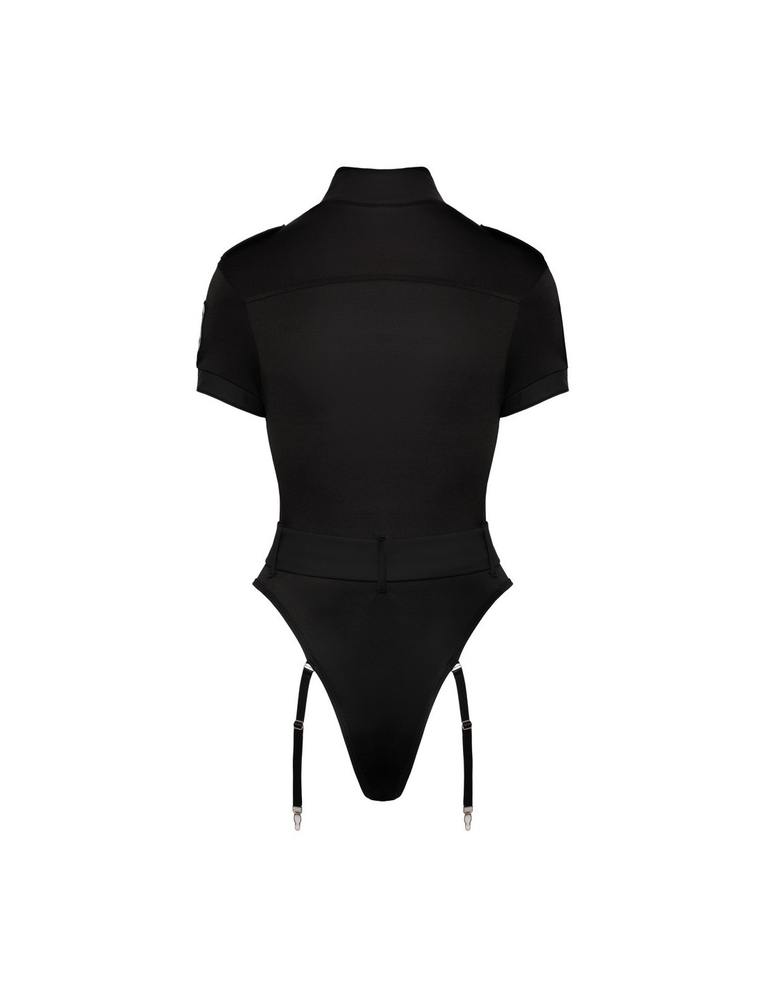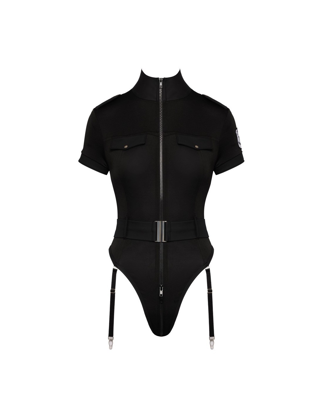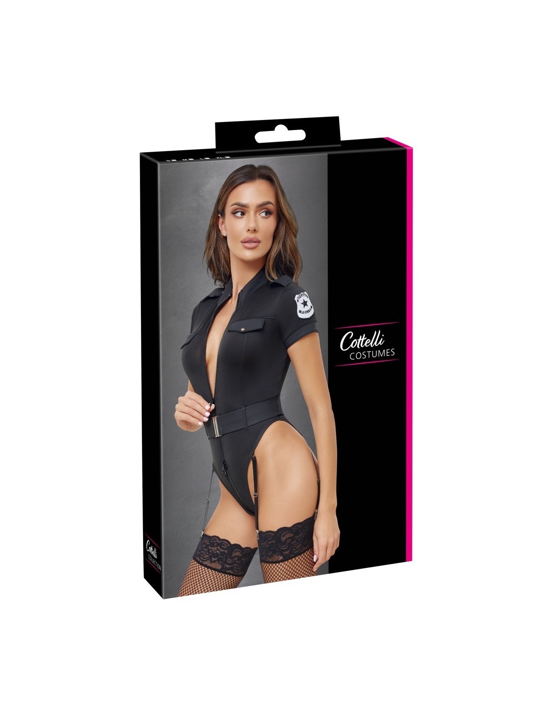 Black suspender body by Cottelli COSTUMES in the Special Police style with eye-catching emblem on the left arm. Soft, cuddly stretch material mixed with matte shiny wetlook. High-necked strict look and with half-sleeves. Shoulder and chest flaps for the typical police look. Also with loops for the enclosed stretch belt with a beautiful silver-coloured buckle. The full-length 3-way zip runs from the high stand-up collar down to the crotch. The suspenders are adjustable and also completely removable from the body.