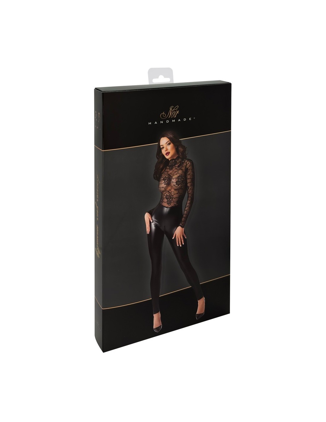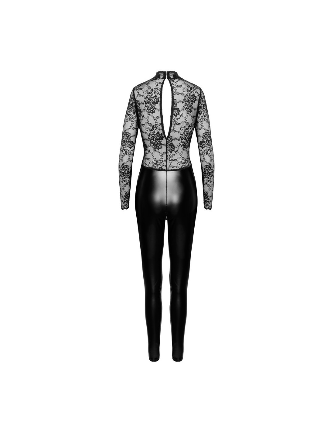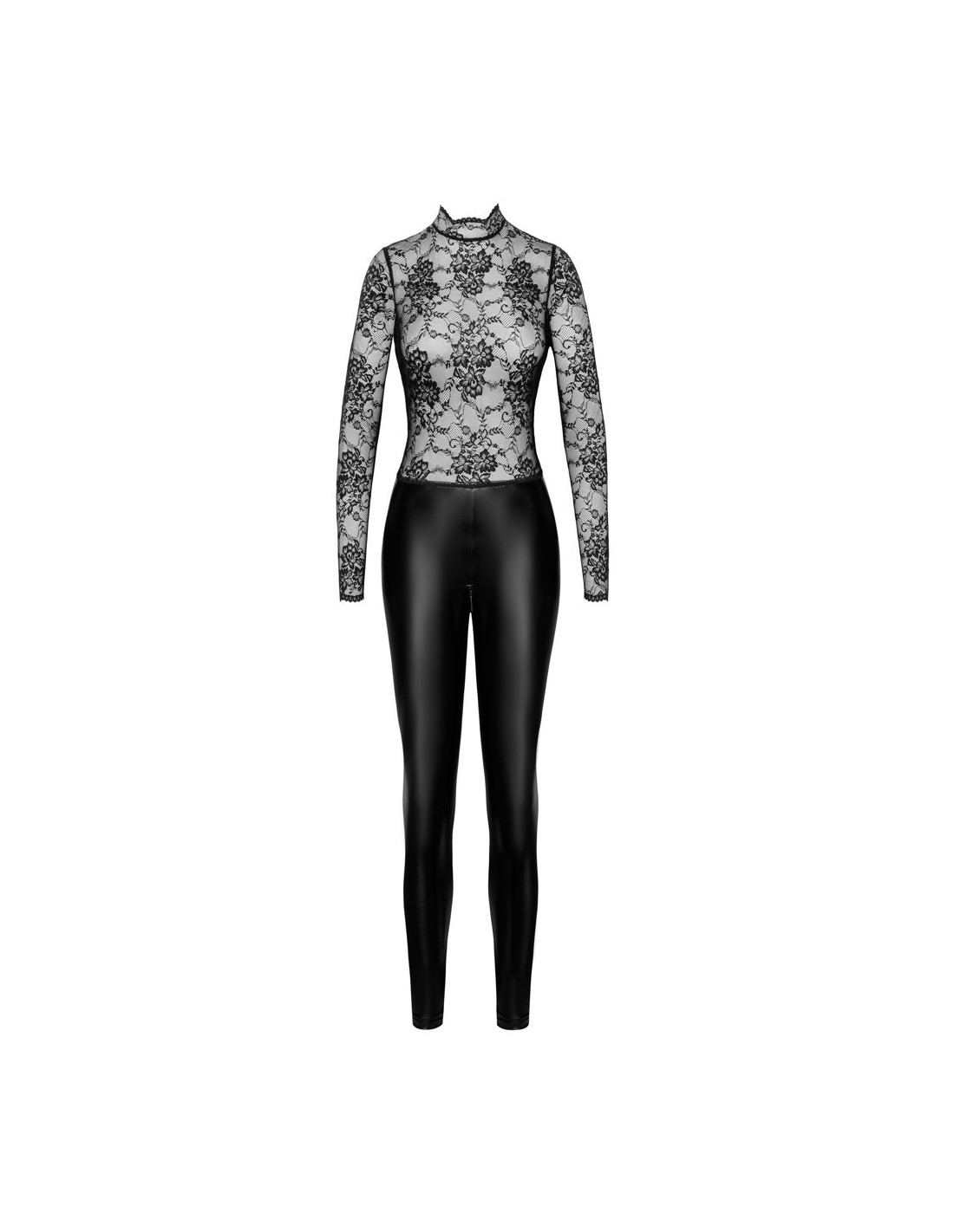 Tuta aderente nera a maniche lunghe Orgia Exclusive by Noir realizzata in splendido pizzo (top) misto a powerwetlook - si adatta come una seconda pelle. Morbida ed elastica per un elevato livello di comfort. Spacco sul retro, collo alto con bottoni. Con cerniera sul cavallo: pratica e seducente allo stesso tempo.