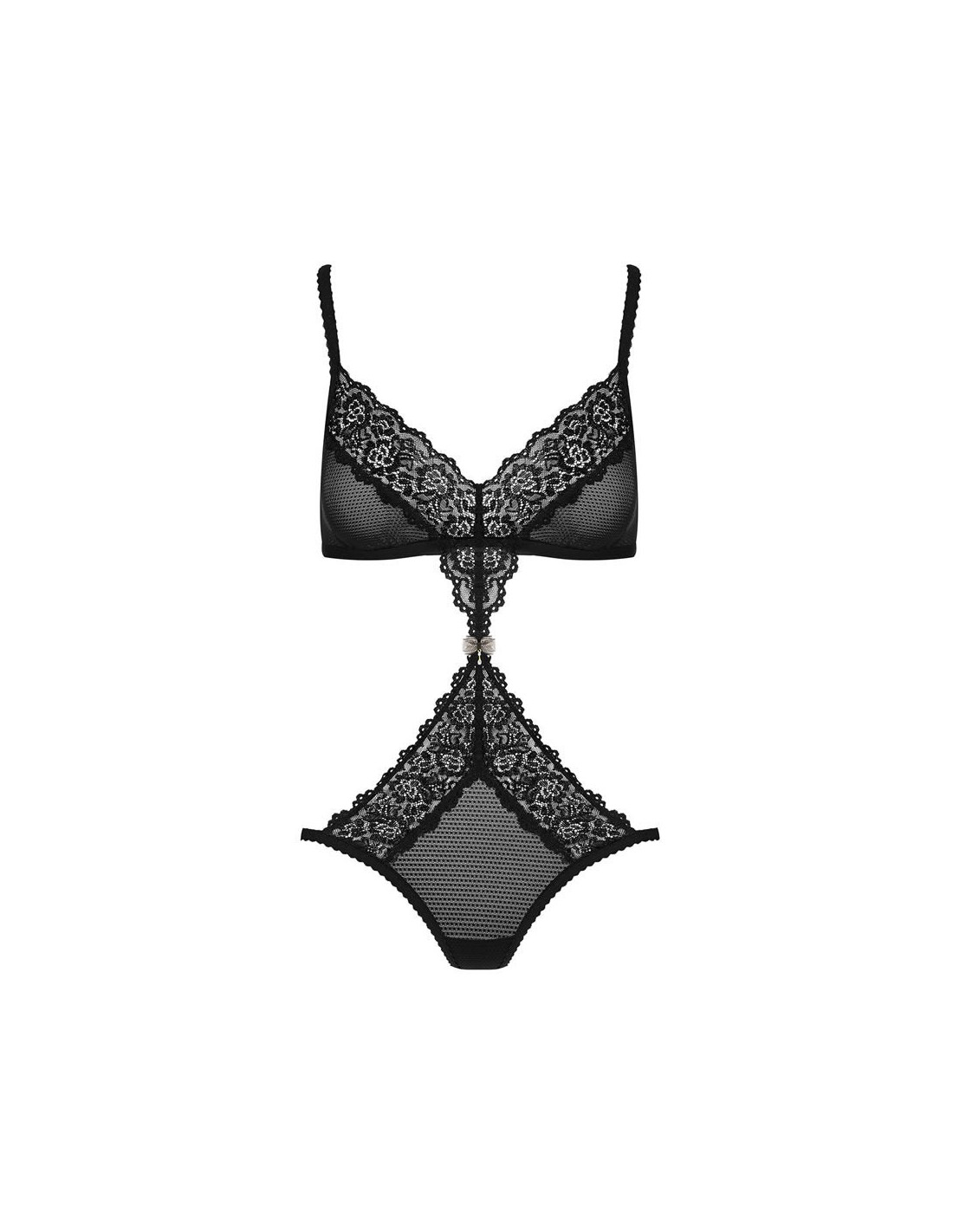 Can you see this unique, hot and absolutely stunning design? It’s been created to let you look like a million dollars and… to give you incredibly pleasant moments with your beloved man! Don’t wait – get this amazing teddy and feel great! You’ll love every piece of it: - fascinating teddy – bra connected with thong - mesh with a tiny dot pattern - floral lace goes down the body from neckline to belly – incredibly tempting look! - adjustable straps and multistage closure – perfect fitting - charming bow with shiny jewel on belly – like a cherry on a delicious cake! - nice, delicate and perfectly elastic fabrics (82% polyamide, 18% elastane)