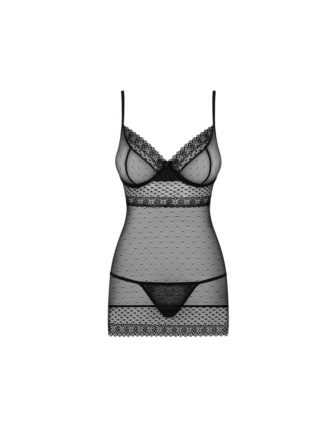 See-through mesh combined with fabulous details and incredibly feminine cut. Guess what? You’ve made a perfect choice! With this sexy chemise you can make him adore you even more. Do it babe! Turn around and show him your fantastically accentuated curves! Find out more: - sexy, tight-fitting chemise with a dot pattern - elegant, lacy edges - adjustable straps - underwire cups – temptingly accentuated bust - vertical sewing on breasts – sexy curves! - adjustable closure with decorative ribbon - intriguing cut on the back - the product includes chemise and thong - nice, elastic fabrics (90% polyamide, 10% elastane)
