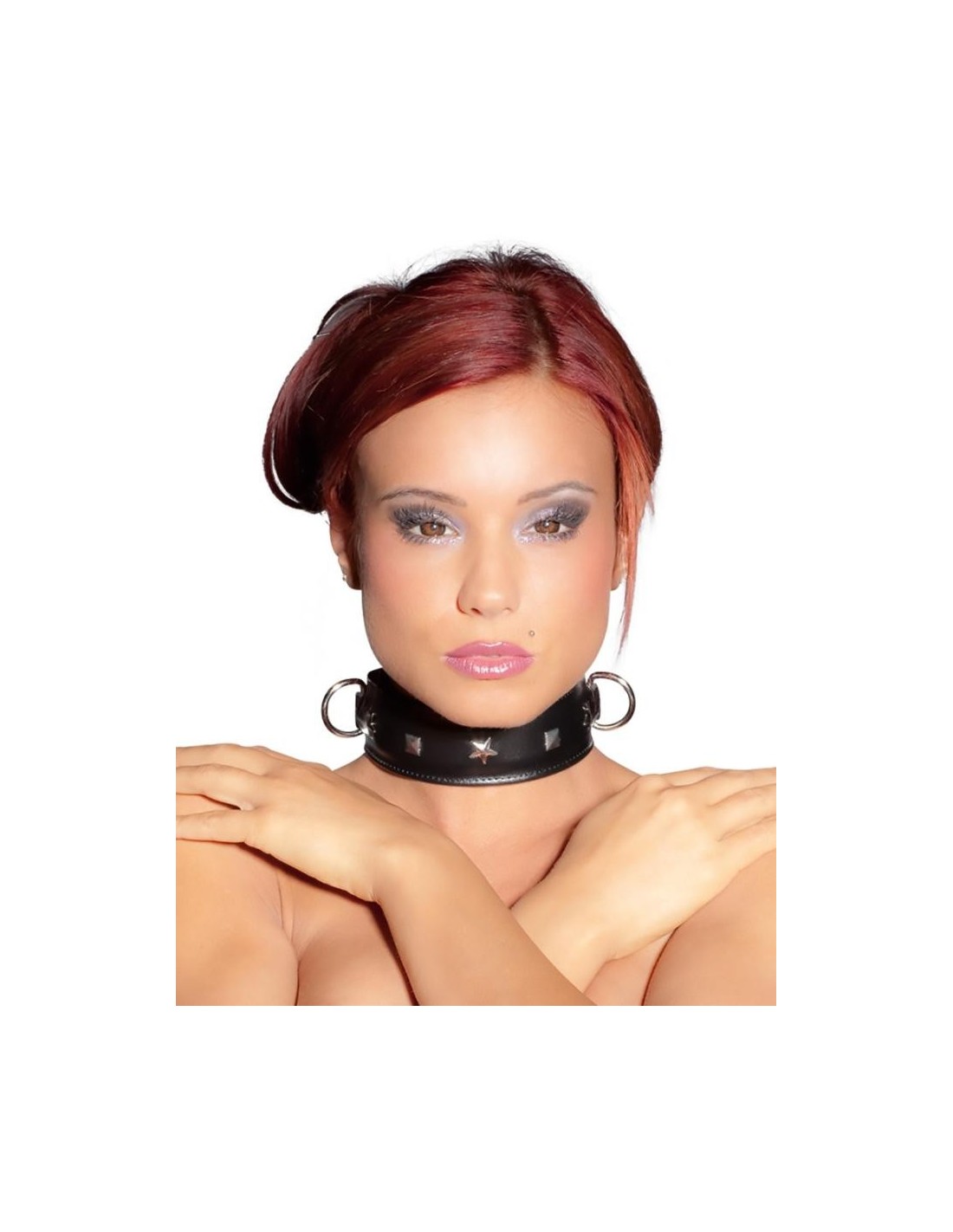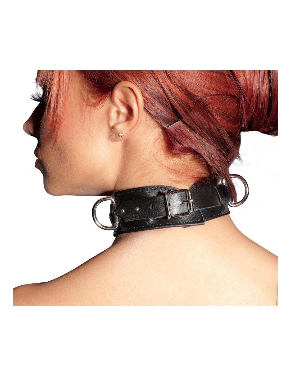 Vincolo per il collo, completamente realizzato in robusta pelle liscia di alta qualità con bordi cuciti e anelli decorativi. Due anelli a D laterali invitano al guinzaglio e alla punizione. Regolabile in dimensione.