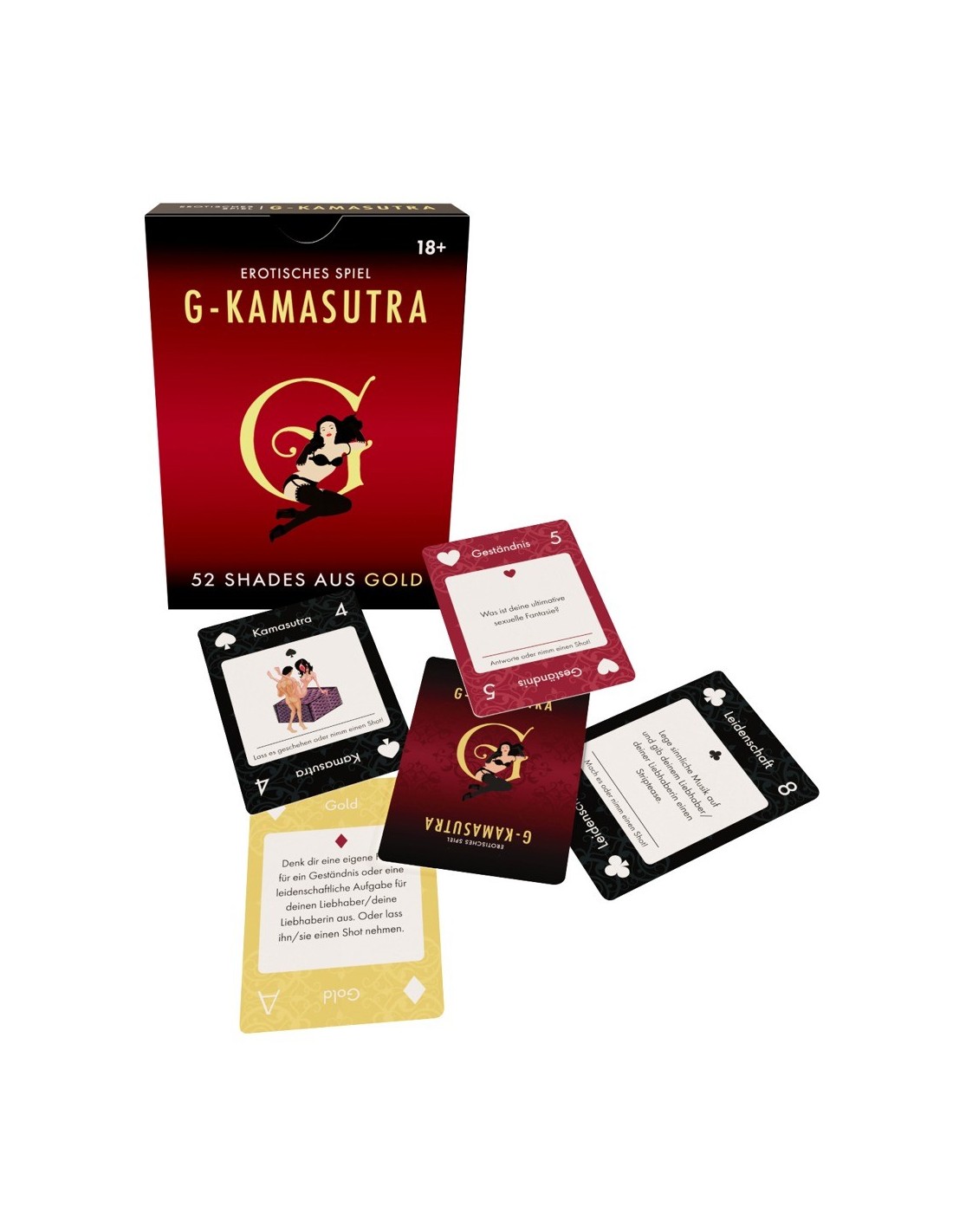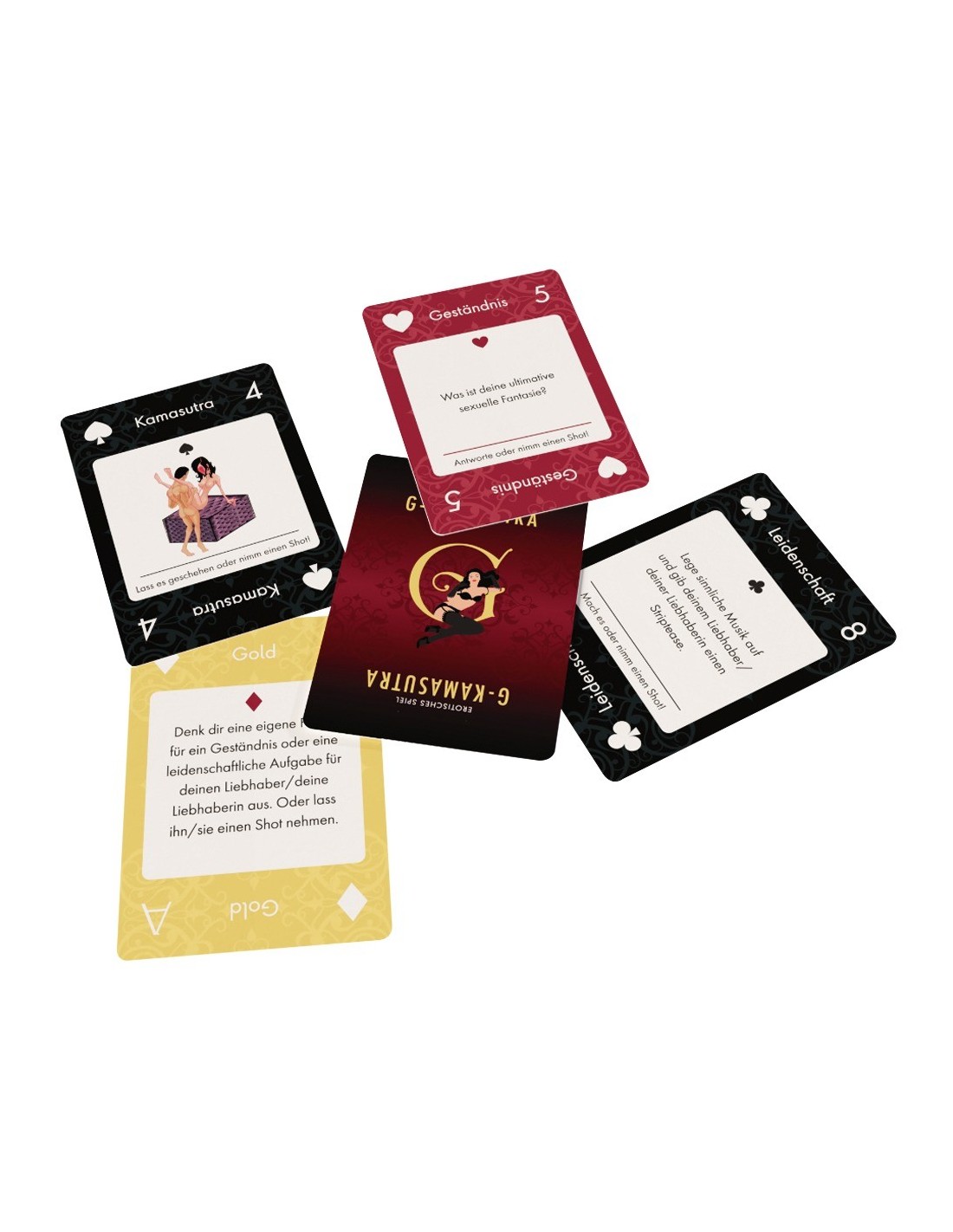 52 carte da gioco (21 carte passione, 19 carte confessione, 8 carte Kamasutra e 4 carte oro più 2 jolly)