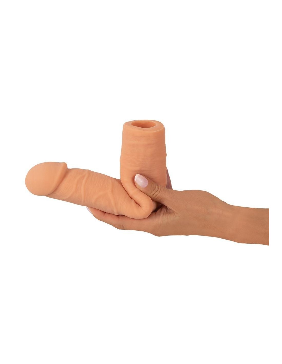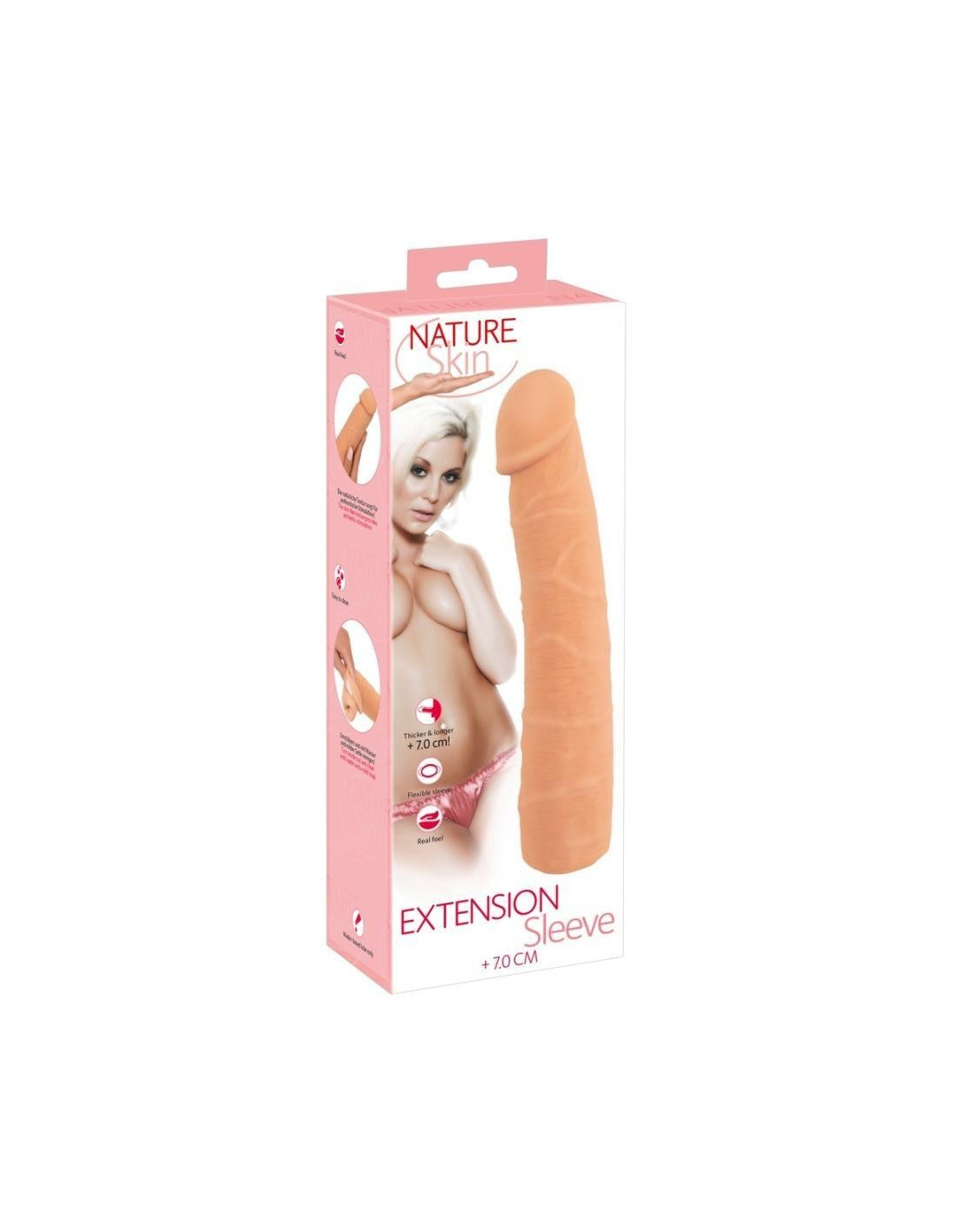 La guaina per pene Extension Sleeve di Nature Skin allunga il pene di 7 cm e ne aumenta la circonferenza di 2 cm. Per momenti di piacere profondo e appagante per due, basta infilare la guaina venata con il glande rigonfio sul vostro membro.