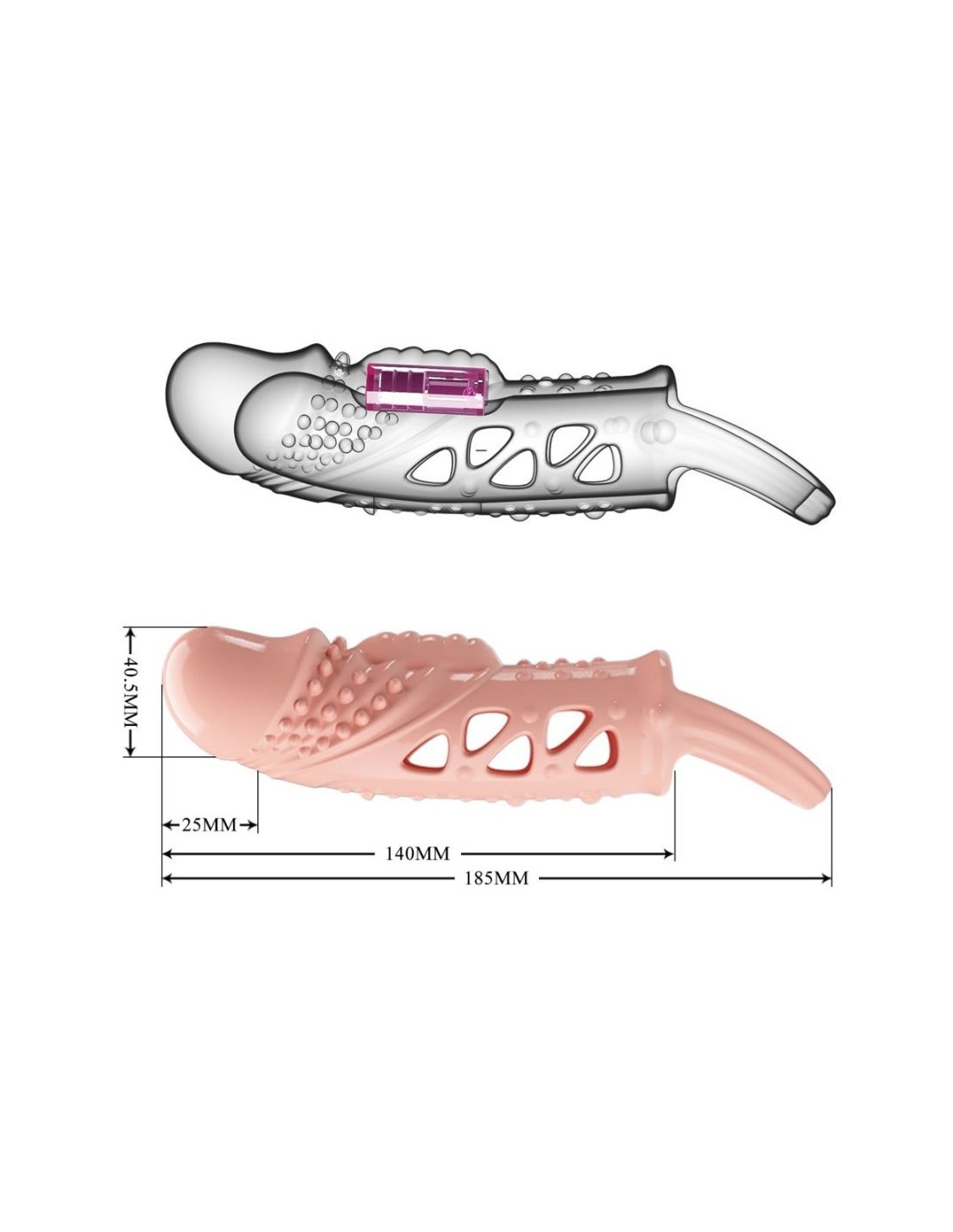 Divertiti davvero in modo sexy con questa guaina vibrante per il pene. Questo manicotto per il pene che migliora l'erezione e promette piacere è realizzato in TPR liscio ed è fissato in posizione da un anello sferico. Un vibratore sulla punta estende la lunghezza del pene e si attiva al contatto. Stimolando la testa del pene fornisce anche una stimolazione interna. La manica elastica abbraccia il pene per un'erezione più forte e più duratura, dandoti più tempo per goderti le vibrazioni!