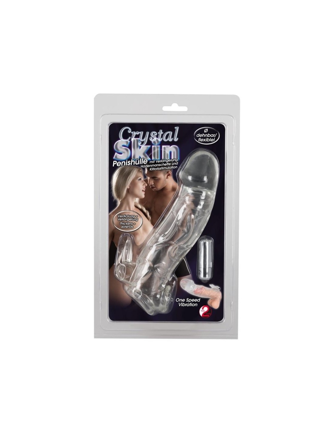 Manicotto del pene trasparente Manicotto del pene con estensione e vibrazione di Crystal Clear con glande massiccio e venature sorprendenti che ispessiscono e allungano il pene di 5 cm. Il manicotto integrato per i testicoli assicura una vestibilità sicura e una piacevole sensazione di presa. Con divaricatore del clitoride che include un vibrobullet rimovibile. Batterie incluse.