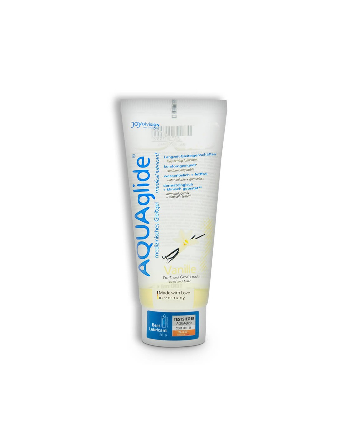 Aquaglide Vanille, lubrificante a base d'acqua, all'aroma Vaniglia ad azione lubrificante di lunga durata, si lava facilmente con l'acqua, dermatologicamente testato, adatto con i profilattici e sex toys. Rende la pelle scivolosa e setosa per intriganti giochi erotici, il compagno ideale per ore sensuali e romantiche. Confezione da 100 ml.