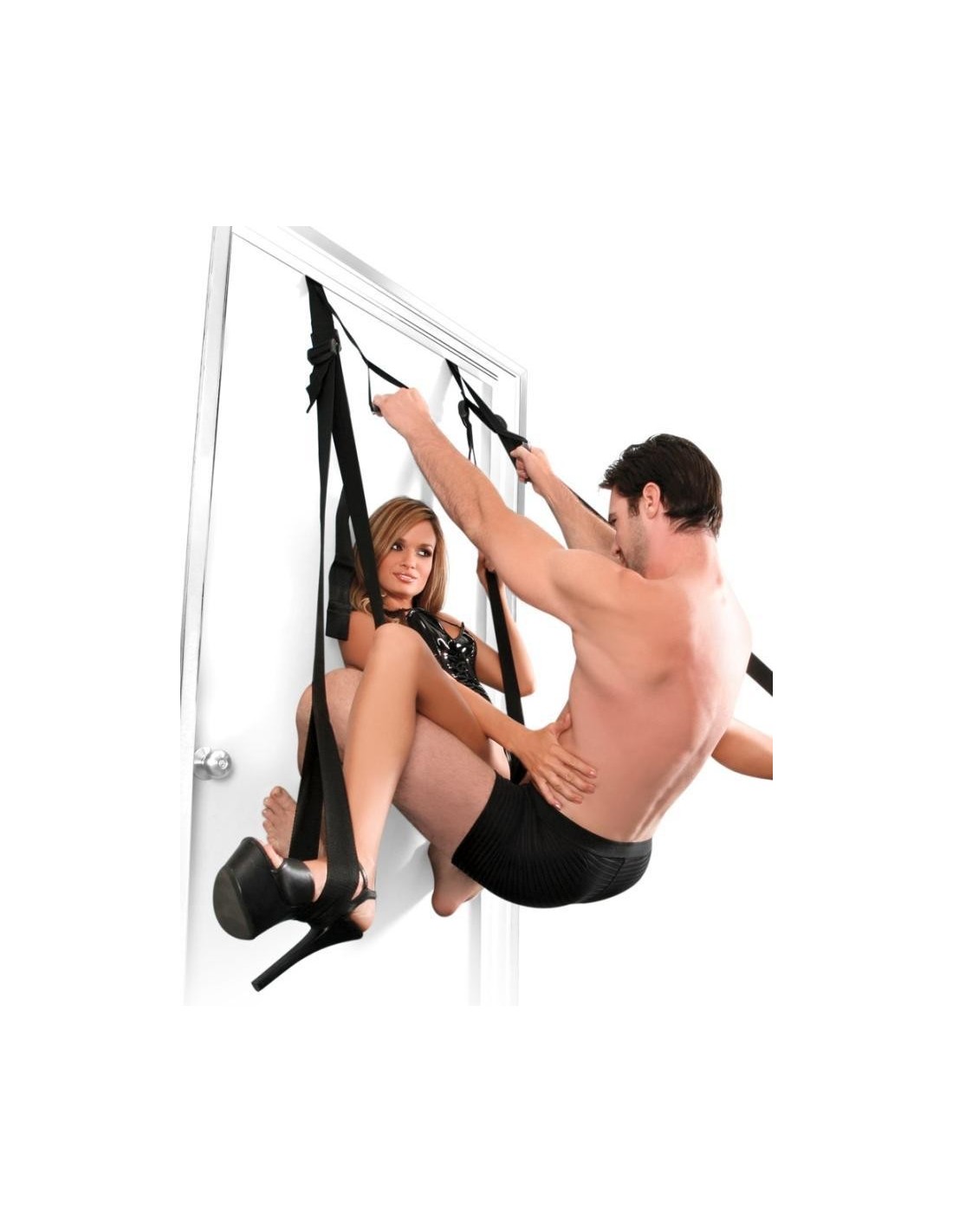 Altalena dell'amore da attaccare alla porta. Non è necessario il montaggio. Composto da due cinghie nere, multiregolabili, con passanti per le gambe su due aste in acrilico, nonché da un guscio del sedile imbottito e passanti per le mani. Può essere caricato fino a 136 kg. Compresa la maschera per gli occhi.