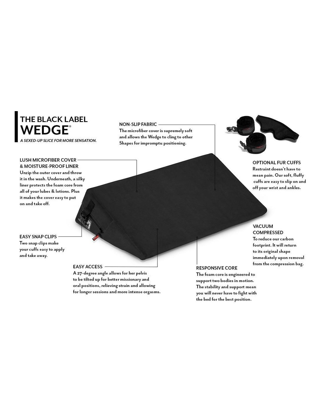 Cuscino d'amore cuneiforme ergonomicamente ottimizzato di Liberator. Posiziona il bacino e il sedere con l'angolazione perfetta per le posizioni del missionario e della pecorina, per una penetrazione profonda e intensa fino al punto G. Anche il gioco orale è facilitato dal facile accesso alle zone intime. Il cuscino, solido e di dimensioni ideali, offre il giusto sostegno e una comoda soddisfazione.