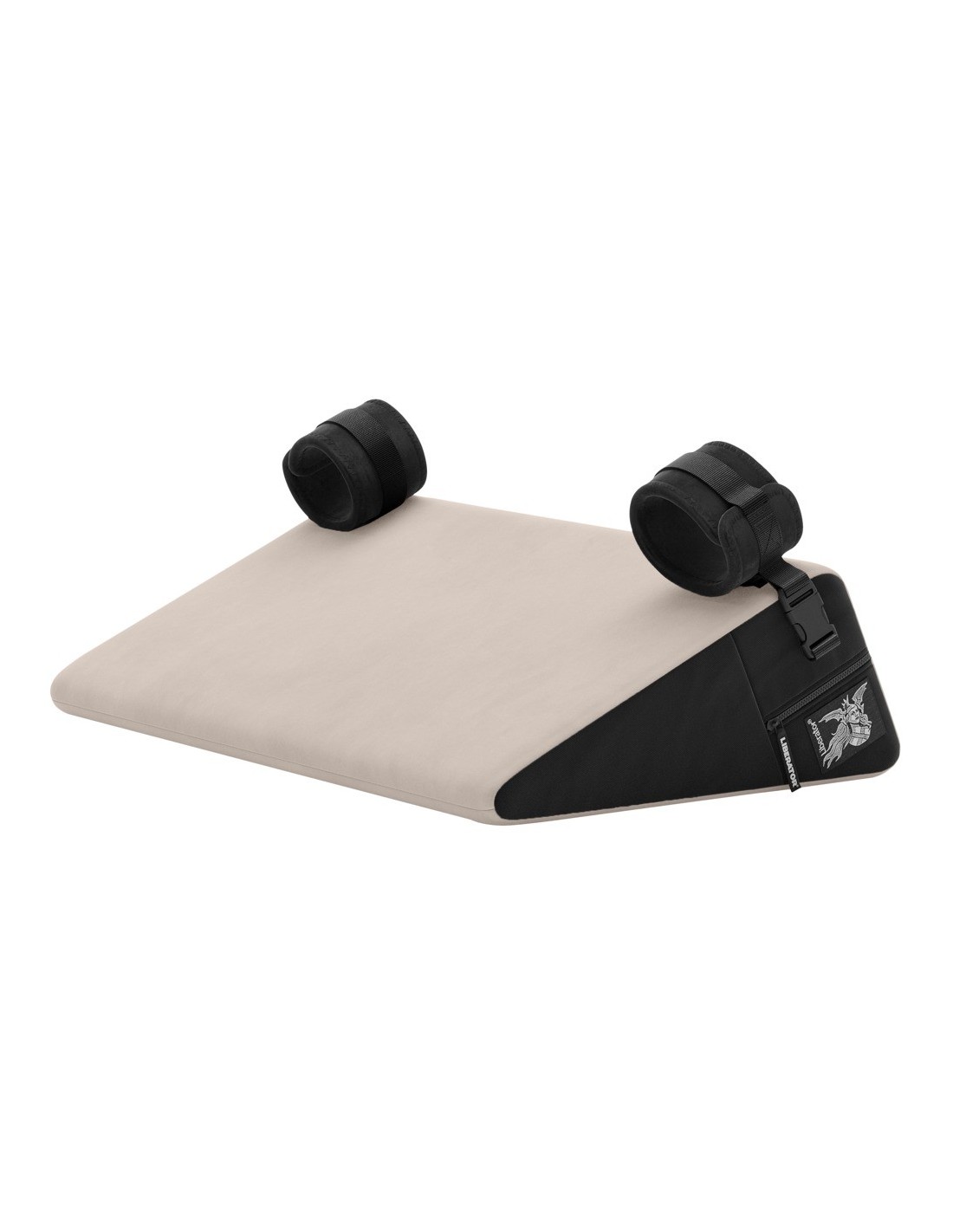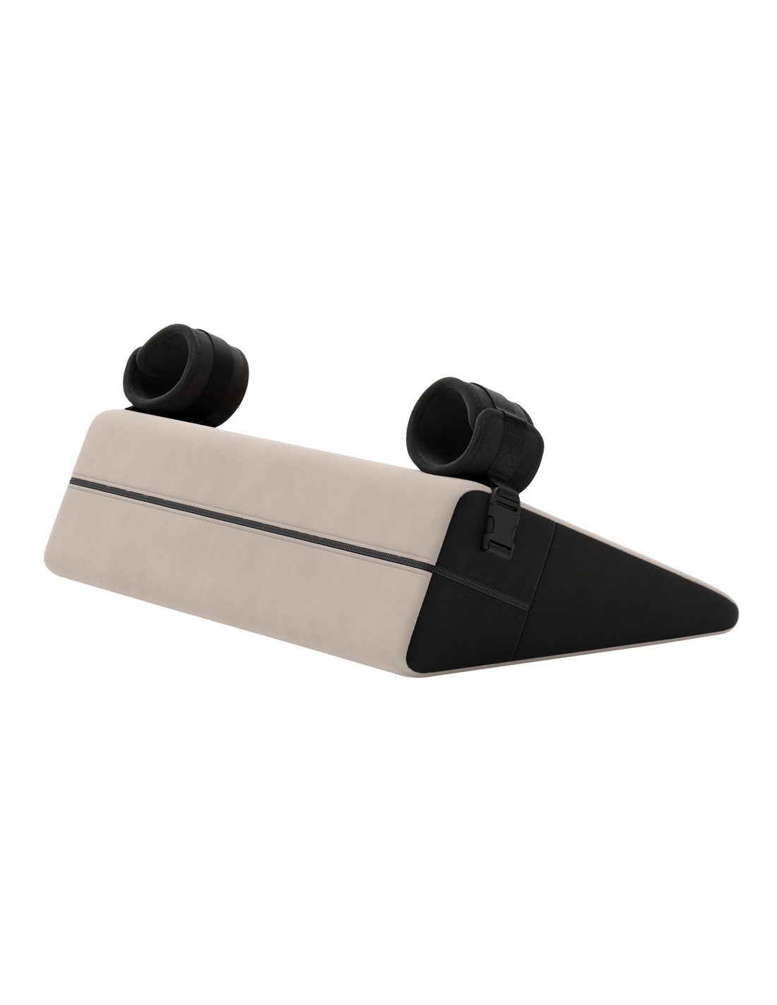 Cuscino d'amore ergonomico a forma di cuneo Bondage Wedge di Liberator con manette rimovibili. Il cuscino a cuneo posiziona il bacino e le natiche all'angolo perfetto per una penetrazione profonda e intensa fino al punto G nelle posizioni del missionario e della pecorina. Anche il gioco orale è facilitato dal facile accesso alle zone intime. Il cuscino, solido e di dimensioni ideali, offre il giusto sostegno e la giusta soddisfazione.