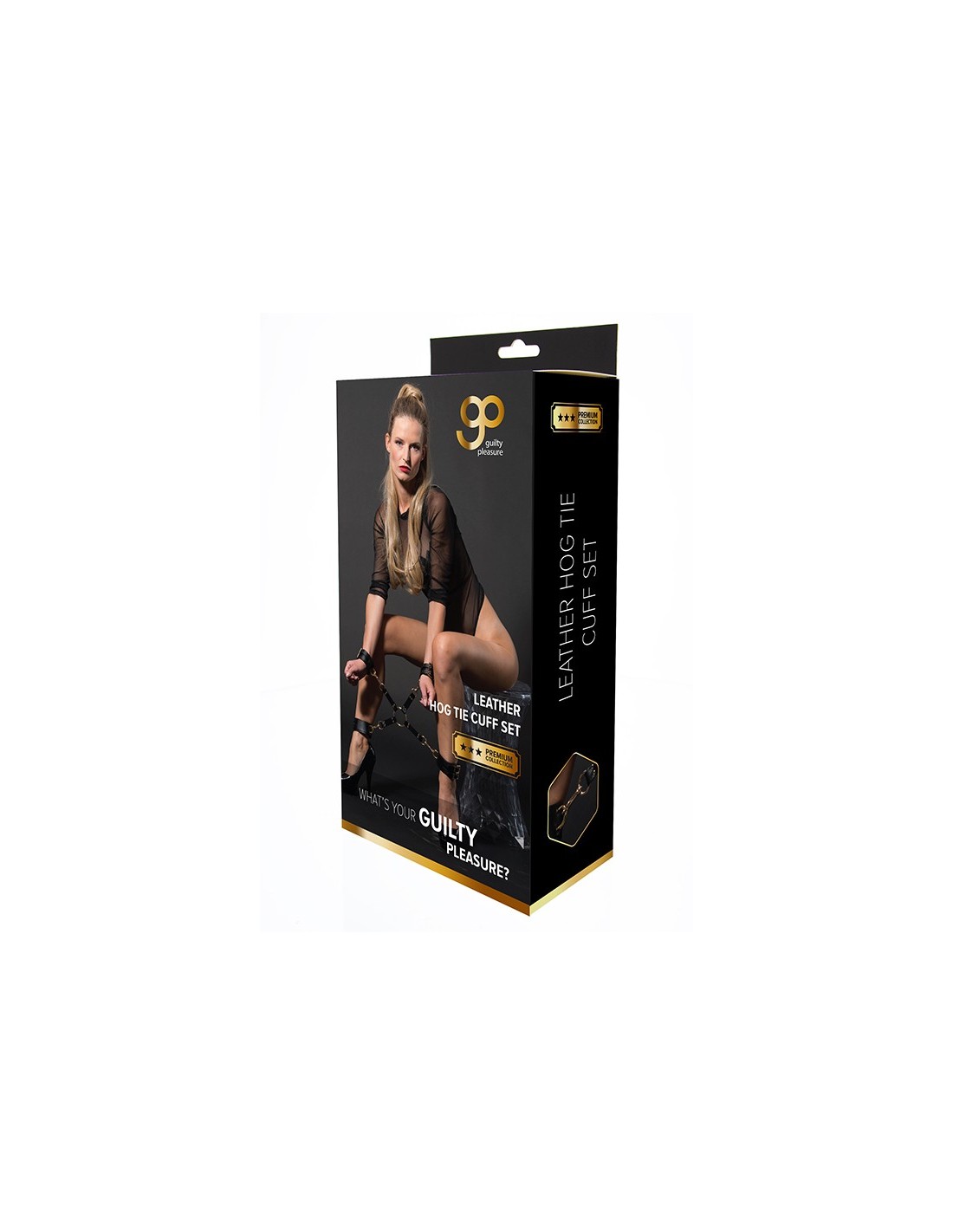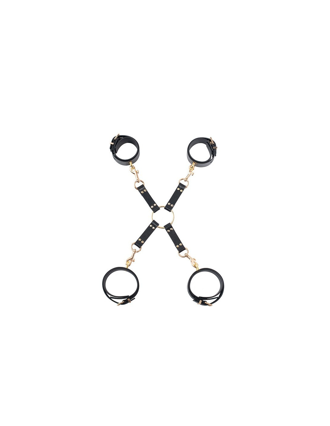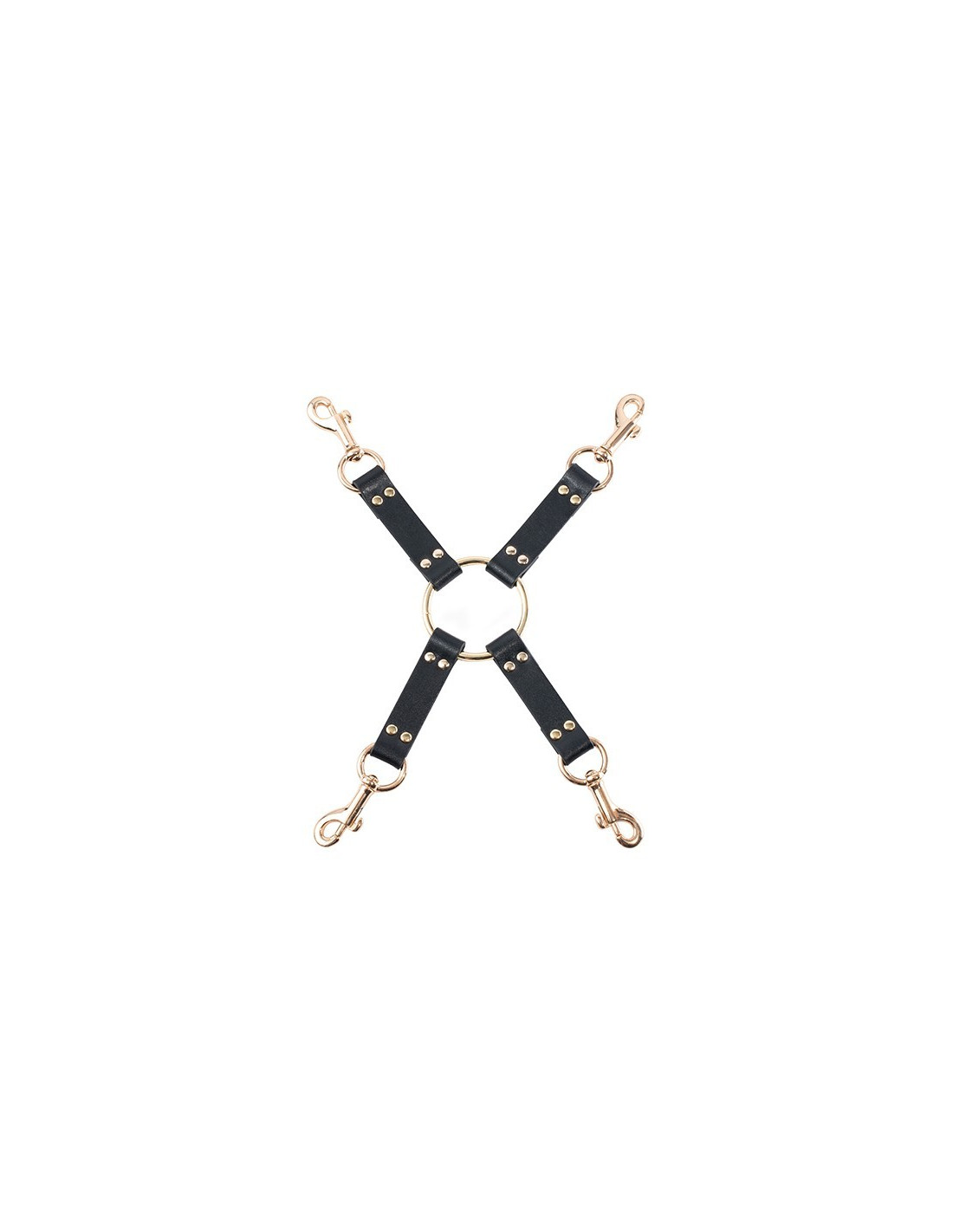 This Hog Tie Set from the Guilty Pleasure BDSM collection is made of vegan leather with gold coloured metal. The set contains a connector with 4 swivel clasp hooks and a center O-ring, 2 hand cuffs with two buckles each and 2 ankle cuffs with two buckles each. The set is a great tool for anyone who loves bondage, to tie the sub by hand and feet and force them in a position. ,