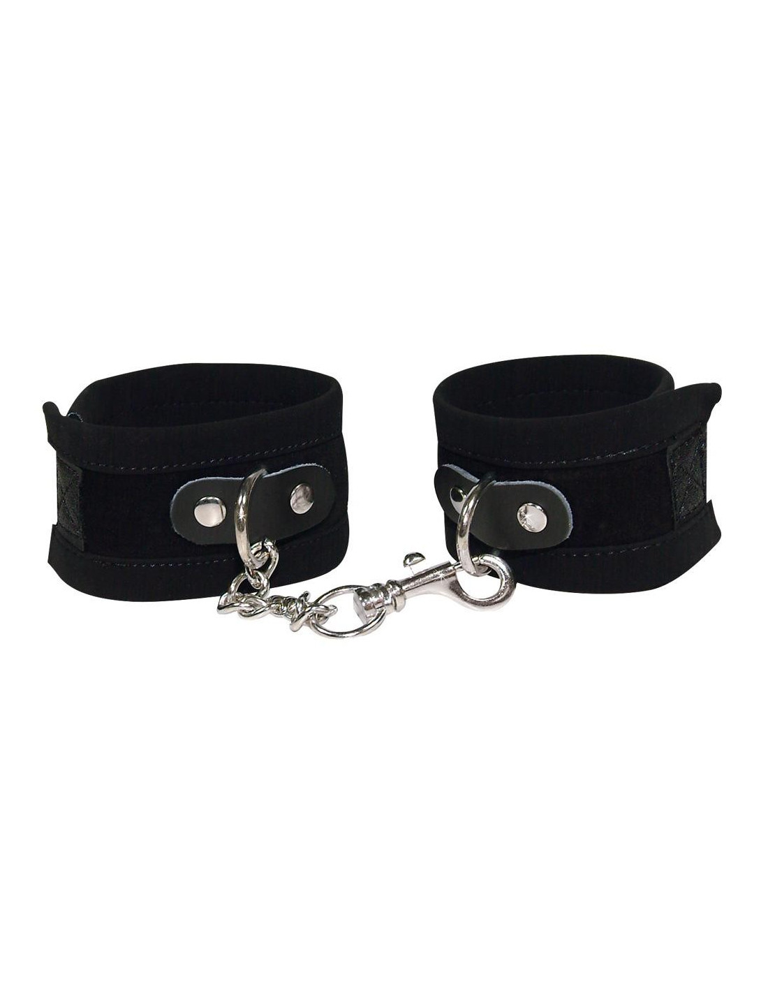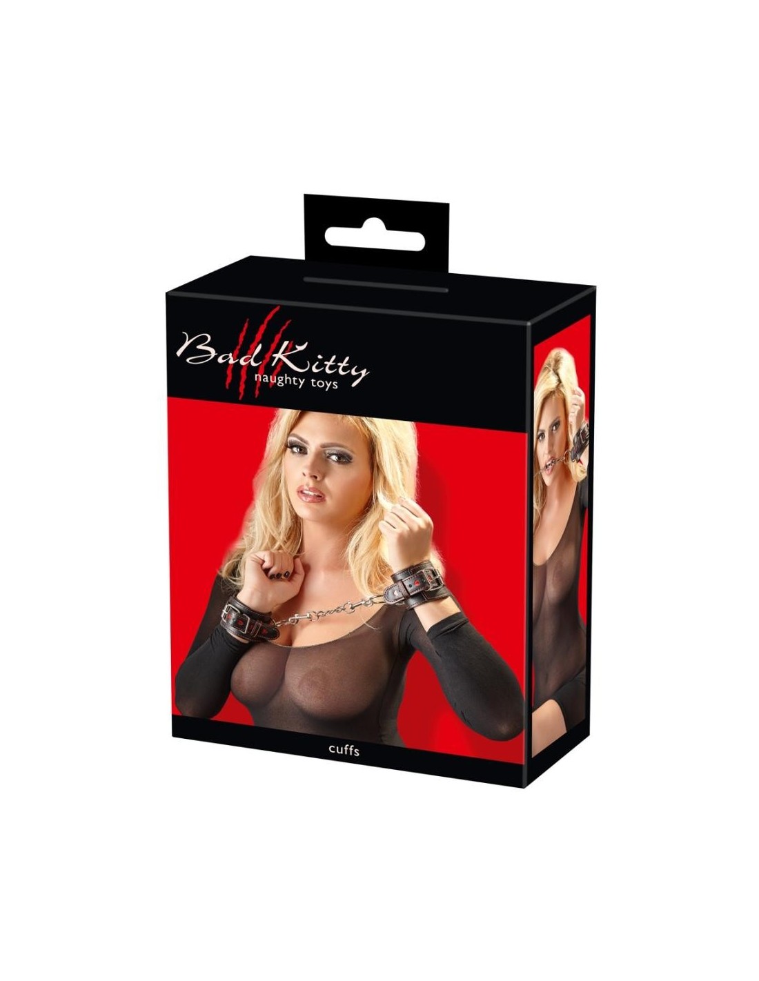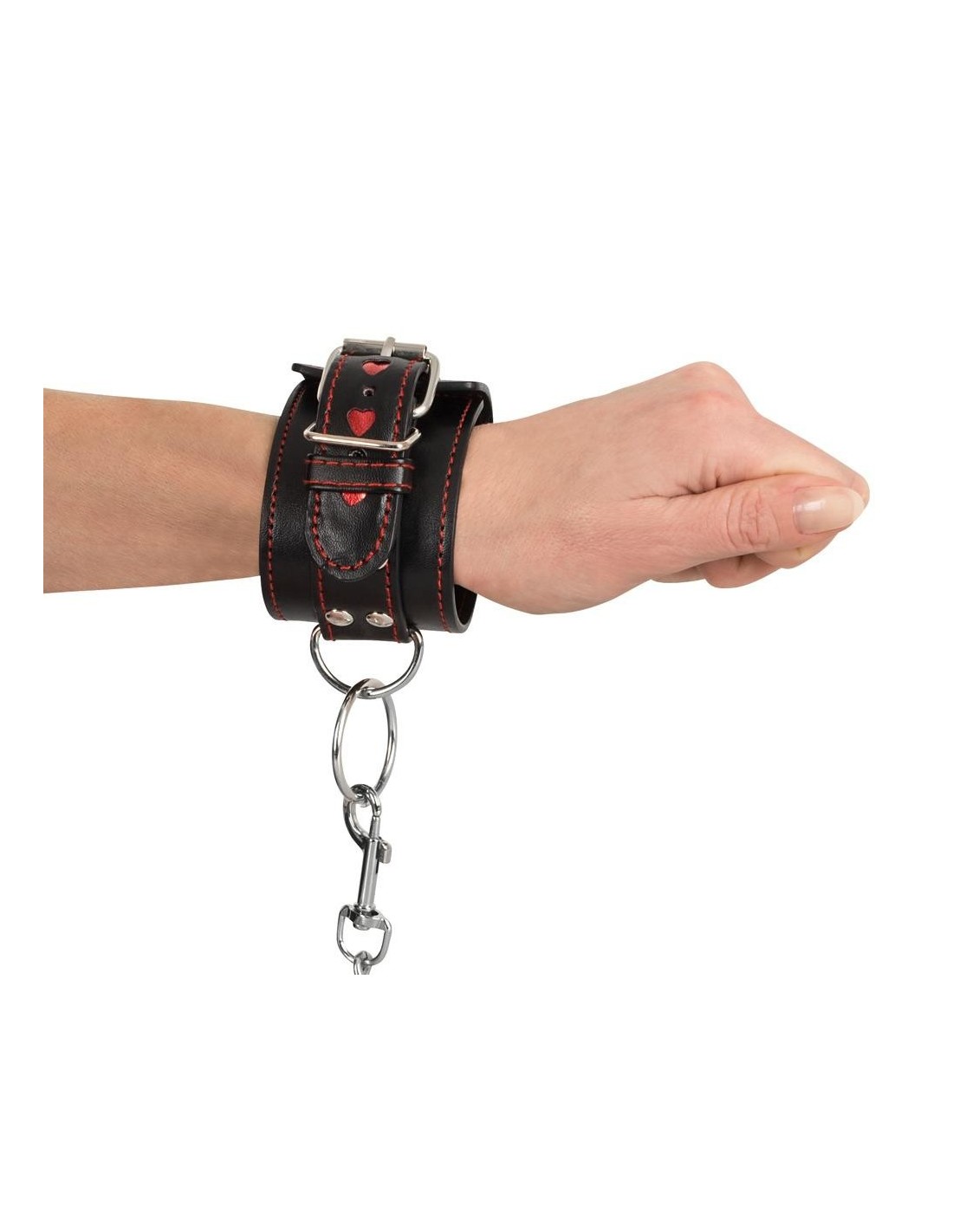 Manette in pelle nera di Bad Kitty con cuciture e piccoli cuori punzonati nel colore rosso del segnale. Con una pratica chiusura a fibbia e una catena di collegamento rimovibile di 15 cm (con moschettoni), questo bracciale stravagante è perfetto anche per i polsi molto stretti - la circonferenza è regolabile da 17-27 cm.