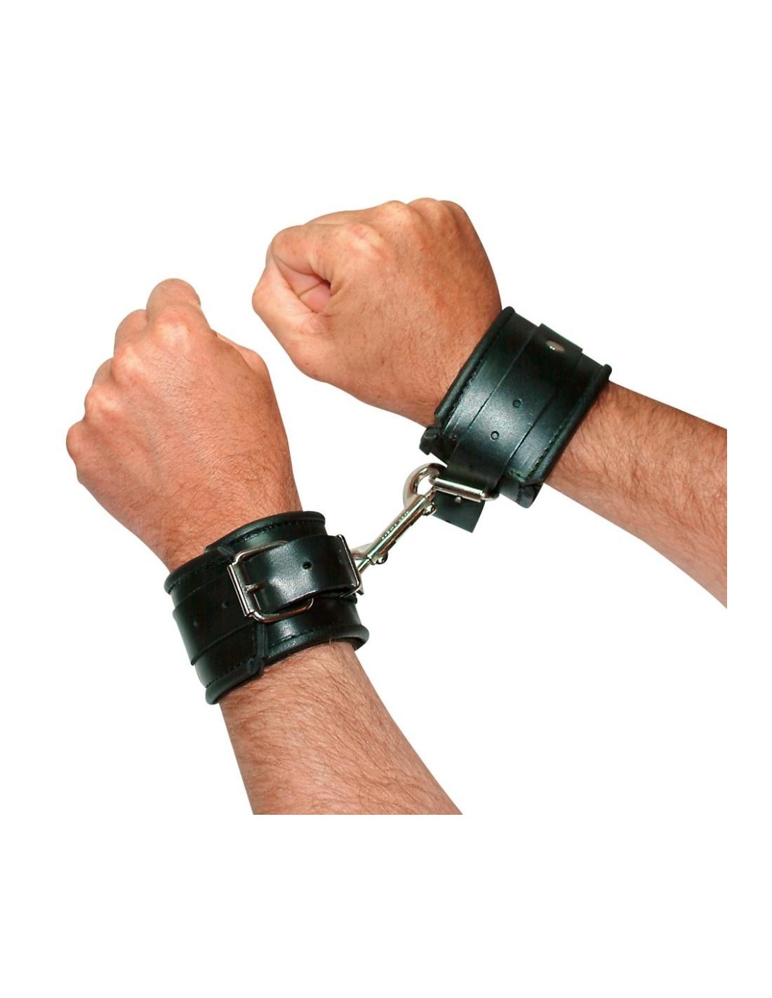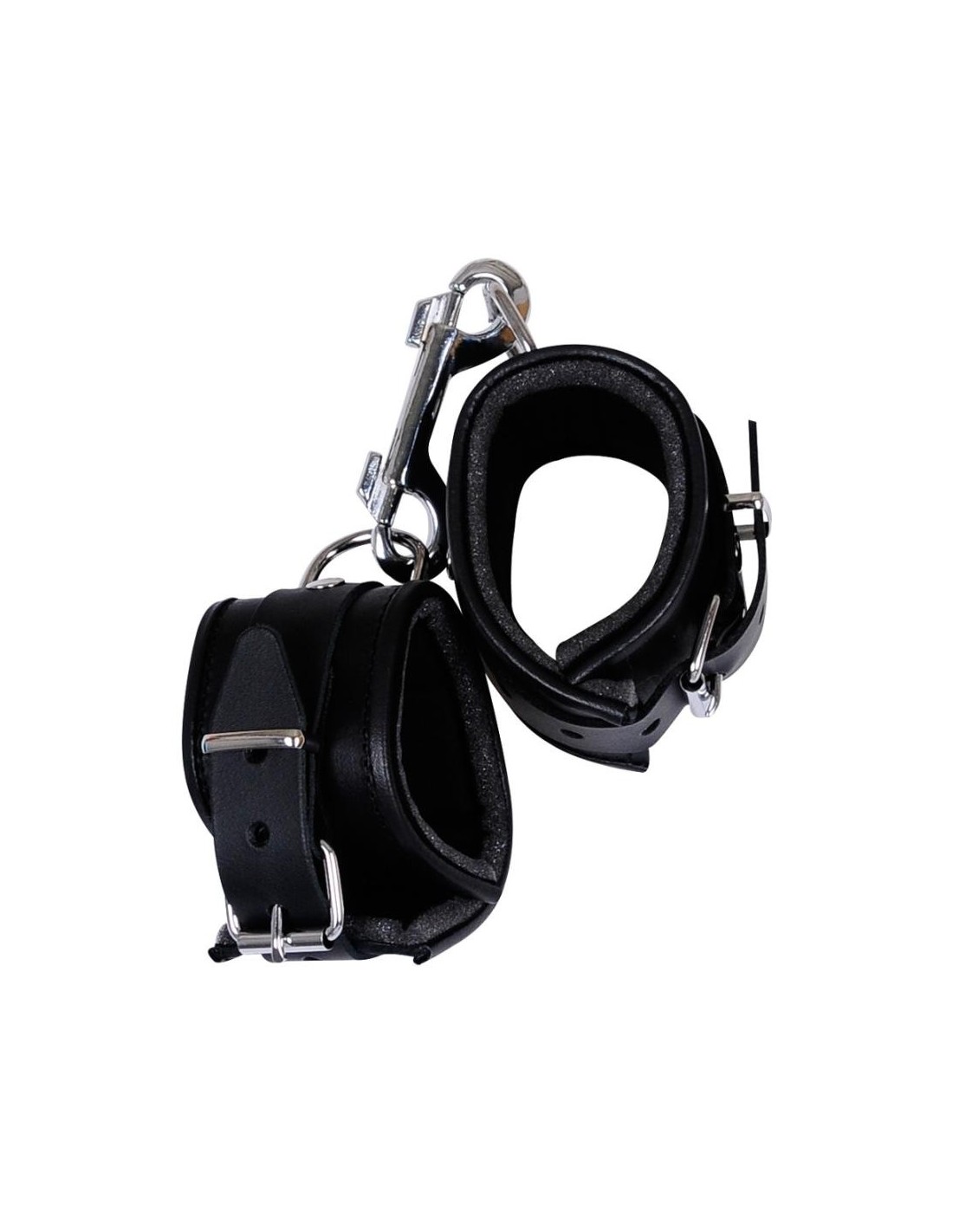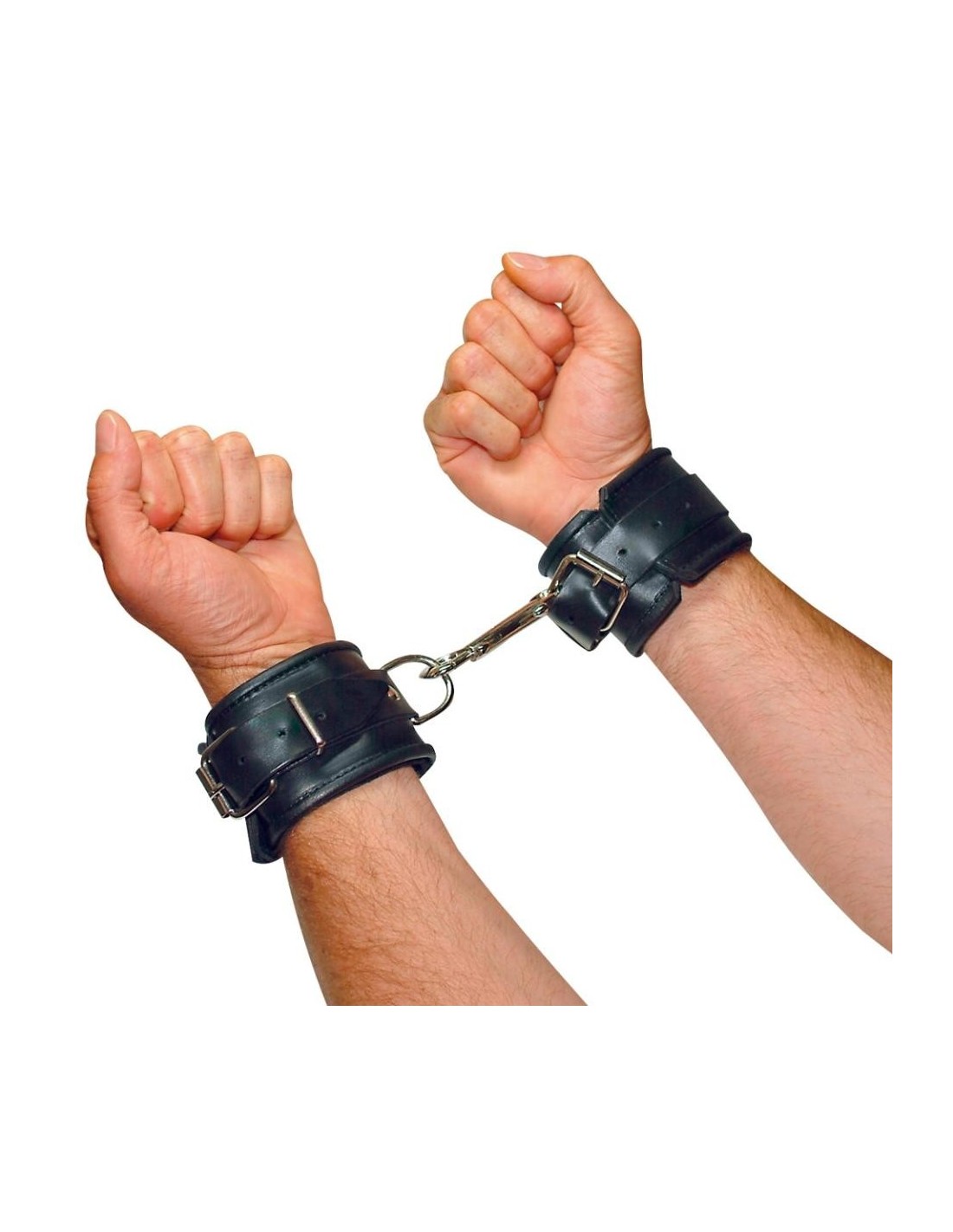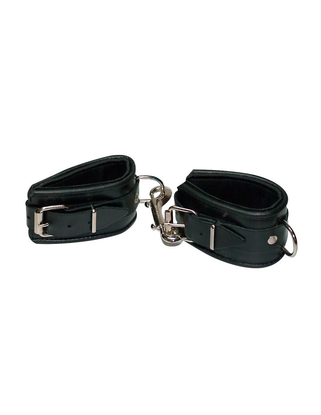 Manette in pelle nera di Bad Kitty con cuciture e piccoli cuori punzonati nel colore rosso del segnale. Con una pratica chiusura a fibbia e una catena di collegamento rimovibile di 15 cm (con moschettoni), questo bracciale stravagante è perfetto anche per i polsi molto stretti - la circonferenza è regolabile da 17-27 cm.