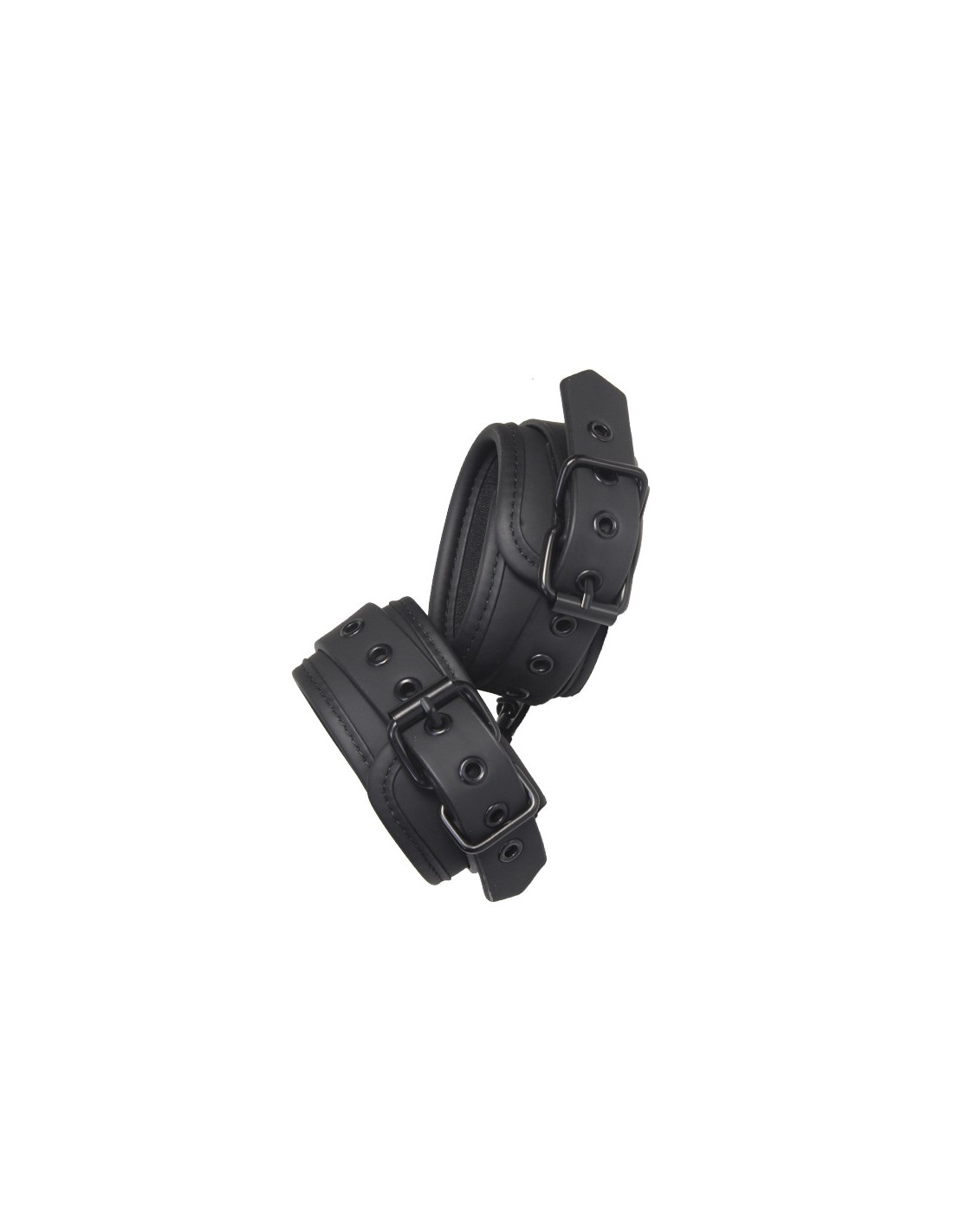 A pair of stylish black ankle cuffs with all black nickel free hardware and lined in a soft yet durable neoprene material for sexy and comfortable play. The ankle cuffs are fully adjustable with the simple belt style buckles. A 12 cm long chain keeps the cuffs together. The chain is detachable on one side with a musketon hook. It is possible to attach more chains or rope hooks, or extra weights.