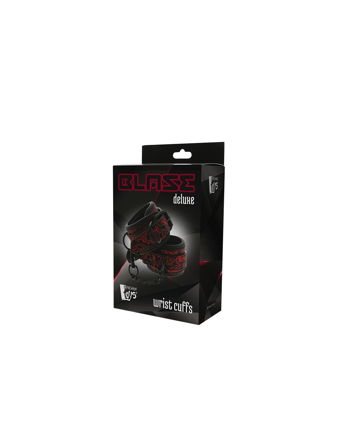 A pair of stylish hand cuffs with an embroidery decoration. They have all black nickel free hardware and are lined in a soft yet durable neoprene material for sexy and comfortable play. The wrist cuffs are fully adjustable with the simple belt style buckles. A 10 cm long chain keeps the cuffs together. The chain is detachable on one side with a musketon hook. It is possible to attach more chains or rope hooks, or extra weights.