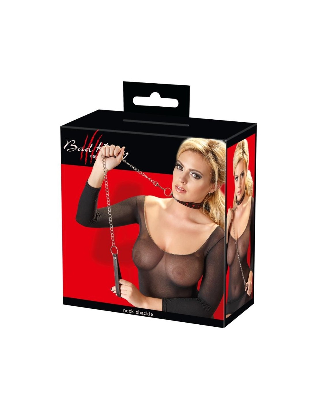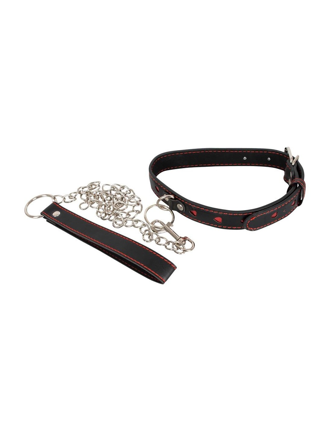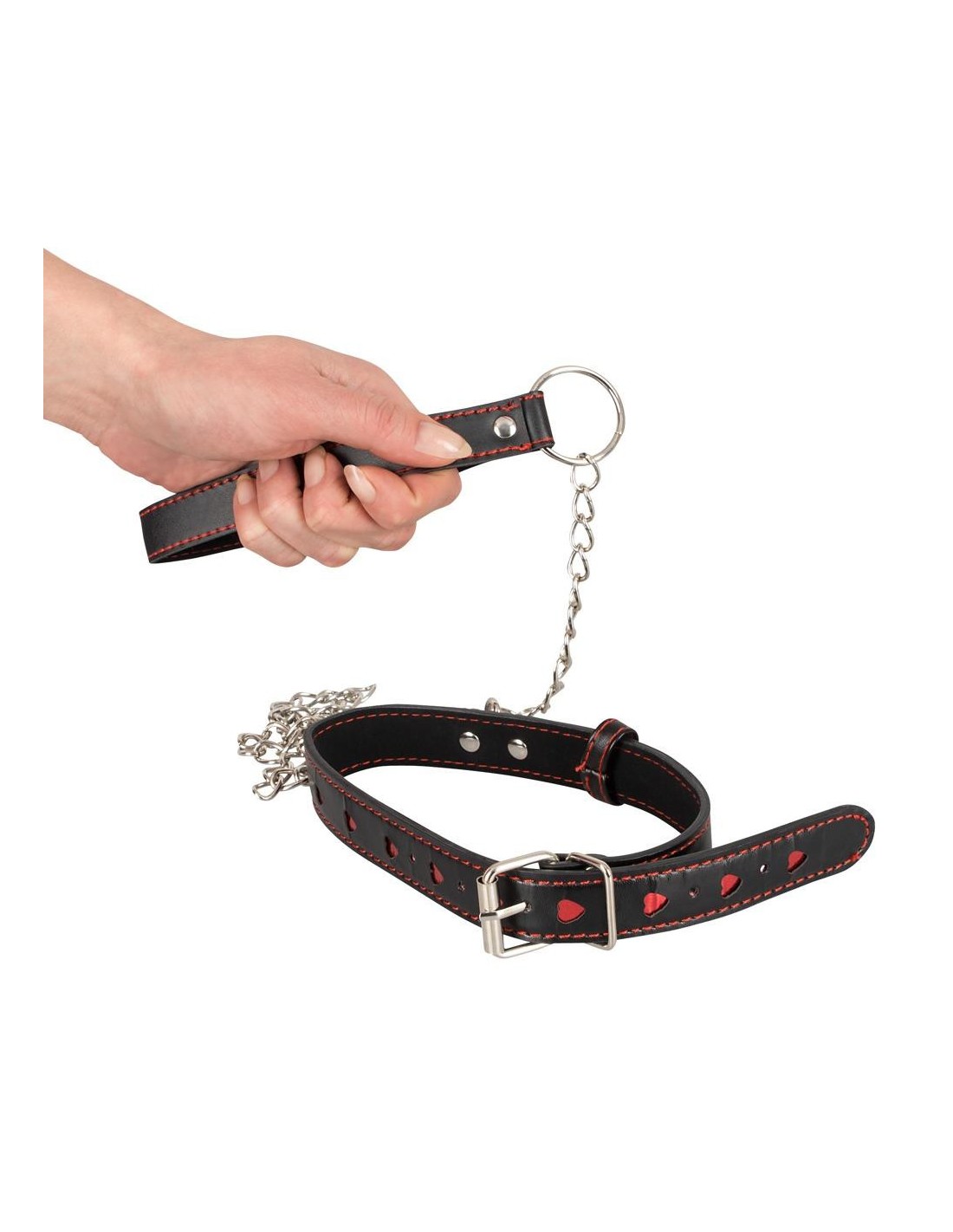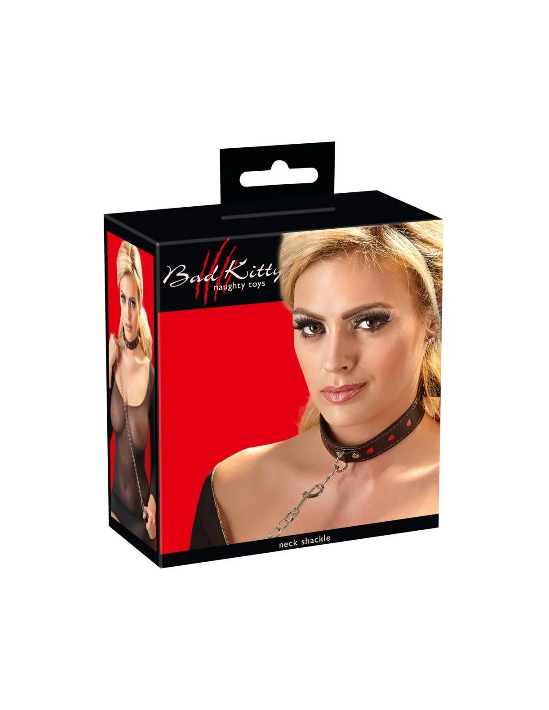 Legame per il collo più guinzaglio in un set di Bad Kitty. Polsino e cinturino del guinzaglio in pelle nera nobile con cuciture rosse. Il collare è inoltre decorato con cuori rossi danzati. Guinzaglio a catena ed elementi in metallo in argento lucido. Polsino da collo con anello sul davanti per attaccare il guinzaglio in dotazione. Regolabile in circonferenza da 35 cm a 48 cm con chiusura a fibbia. Guinzaglio a catena con moschettone e passante lungo 78 cm.