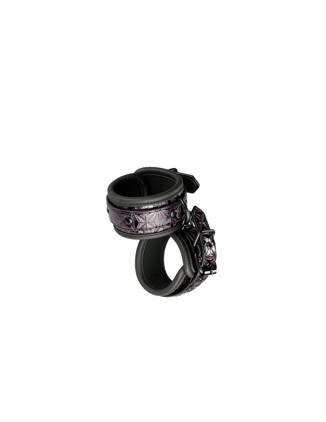 A pair of stylish hand cuffs made of leatherlook material with a sleek and shiny black and purple embossed design. They have all black nickel free hardware and are lined in a soft yet durable neoprene material for sexy and comfortable play. The wrist cuffs are fully adjustable with the simple belt style buckles. A 10 cm long chain keeps the cuffs together. The chain is detachable on one side with a musketon hook. It is possible to attach more chains or rope hooks, or extra weights.