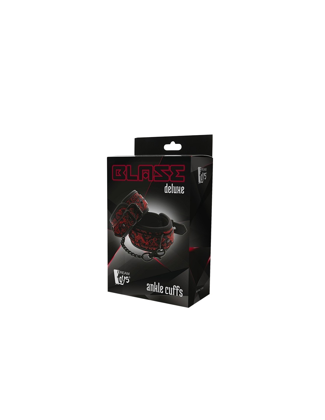 A pair of stylish ankle cuffs with an embroidery decoration. They have all black nickel free hardware and are lined in a soft yet durable neoprene material for sexy and comfortable play. The ankle cuffs are fully adjustable with the simple belt style buckles. A 12 cm long chain keeps the cuffs together. The chain is detachable on one side with a musketon hook. It is possible to attach more chains or rope hooks, or extra weights.