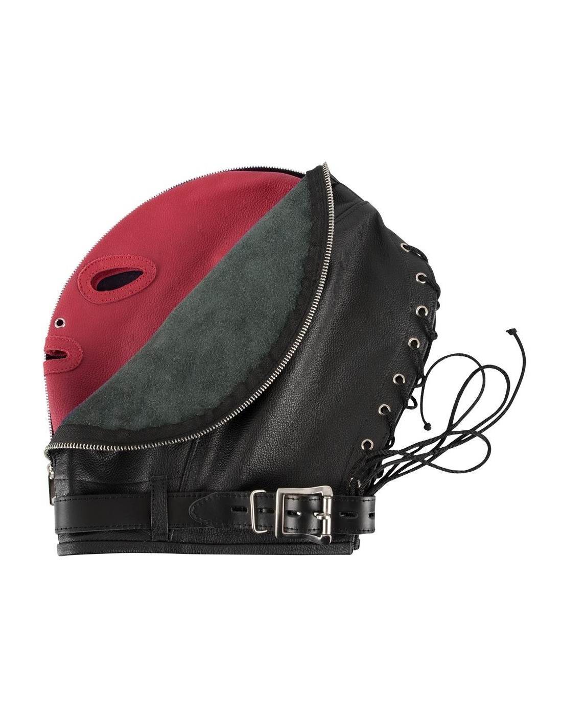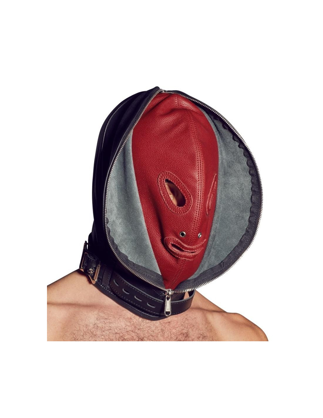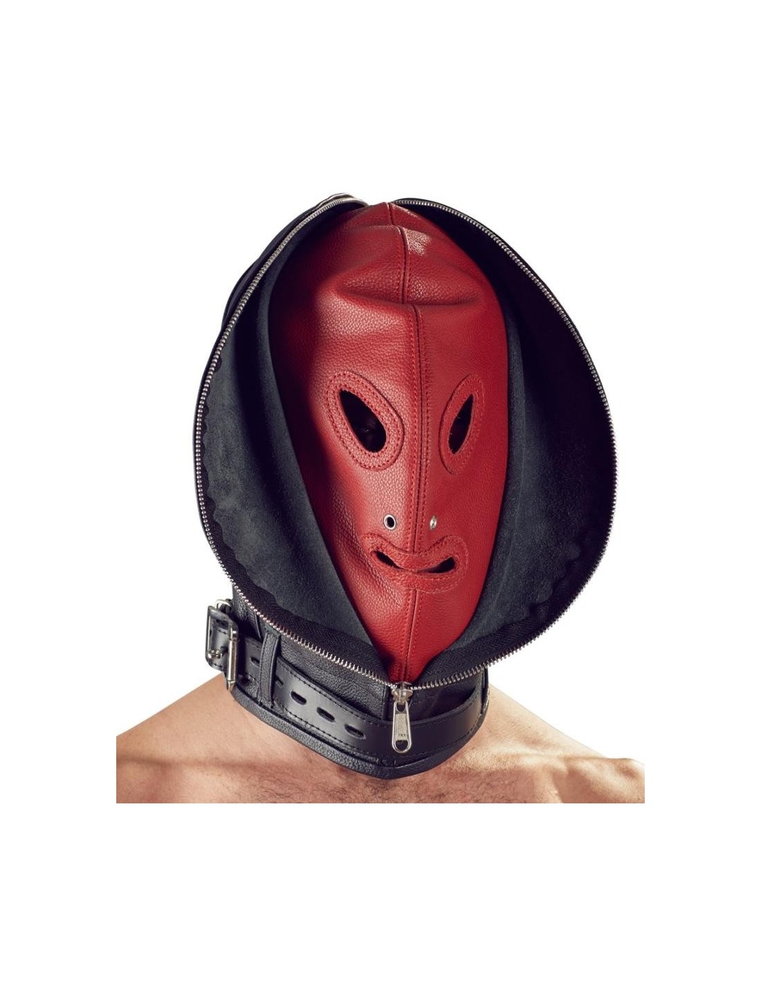 Maschera doppia, composta da una maschera interna e una esterna. La maschera interna ha un'apertura per gli occhi e la bocca. La maschera esterna può essere chiusa con una cerniera sul davanti e allacciatura sul retro. Entrambe le maschere sono saldamente cucite insieme. Il bracciale da collo con chiusura a fibbia è incluso.