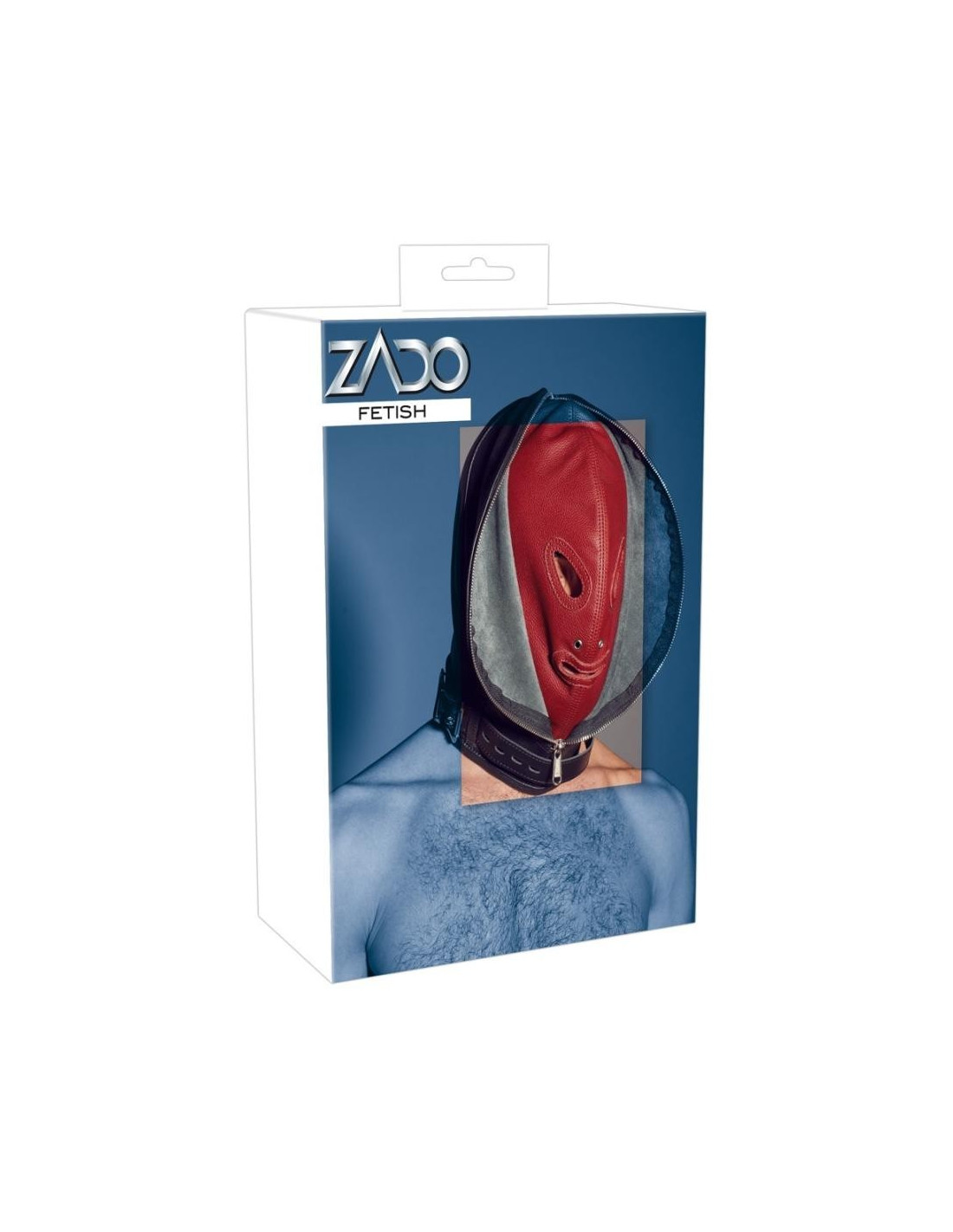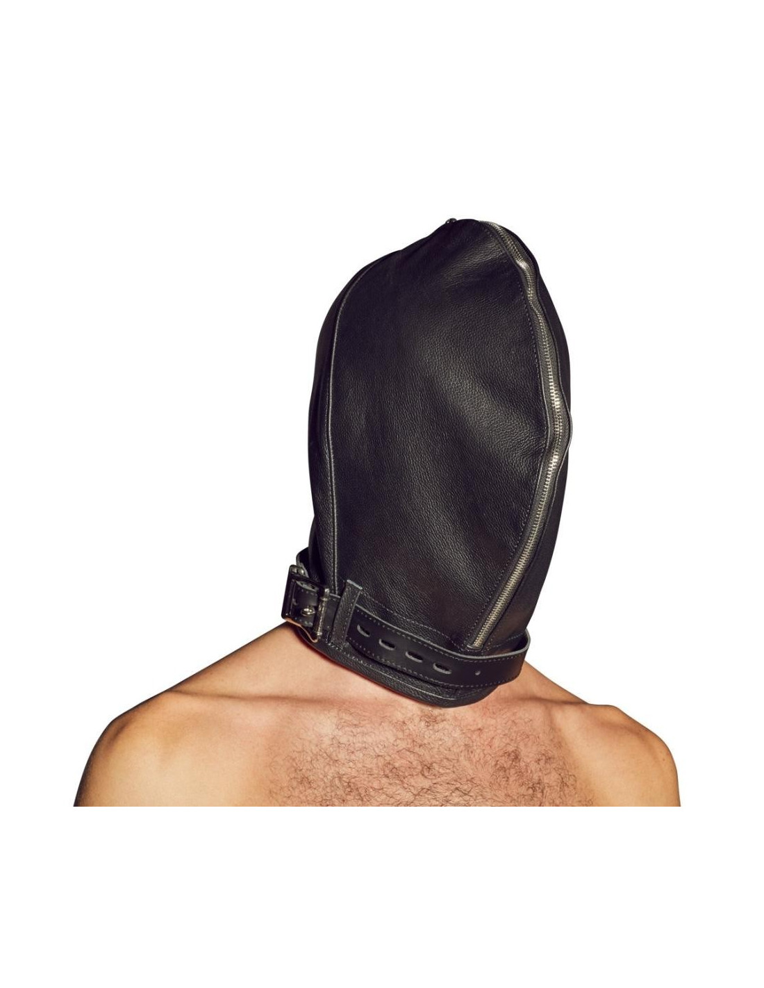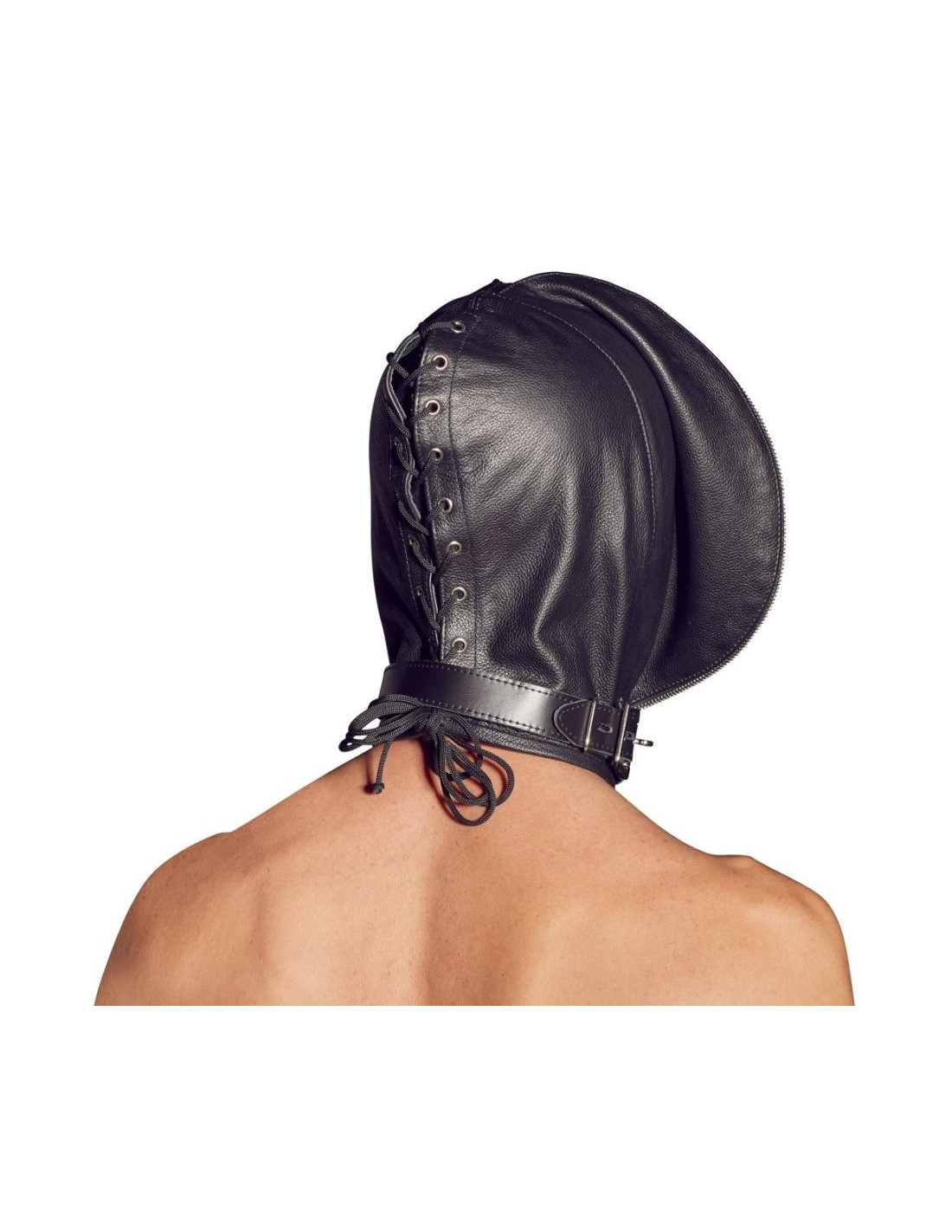 Maschera doppia, composta da una maschera interna e una esterna. La maschera interna ha un'apertura per gli occhi e la bocca. La maschera esterna può essere chiusa con una cerniera sul davanti e allacciatura sul retro. Entrambe le maschere sono saldamente cucite insieme. Il bracciale da collo con chiusura a fibbia è incluso.