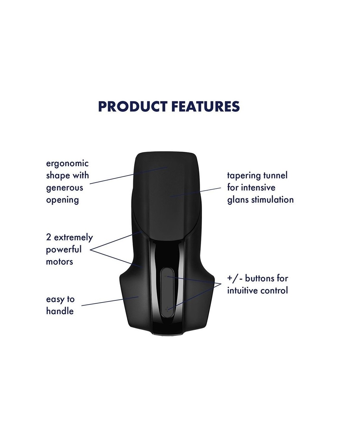 Design mascolino in raffinato colore nero fa del masturbatore un compagno di giochi discreto. Le sue curve ergonomiche fanno sì che stia perfettamente in mano, di modo che si possa comandarne agevolmente i tasti con il pollice mentre la convessità inferiore si inserisce morbidamente nel palmo della mano e le dita fanno comodamente presa nelle fossette laterali. Grazie all'accumulatore ricaricabile il giocattolo quando il masturbatore ha bisogno di nuova energia, è sufficiente ricaricarlo con il cavo magnetico USB in dotazione.