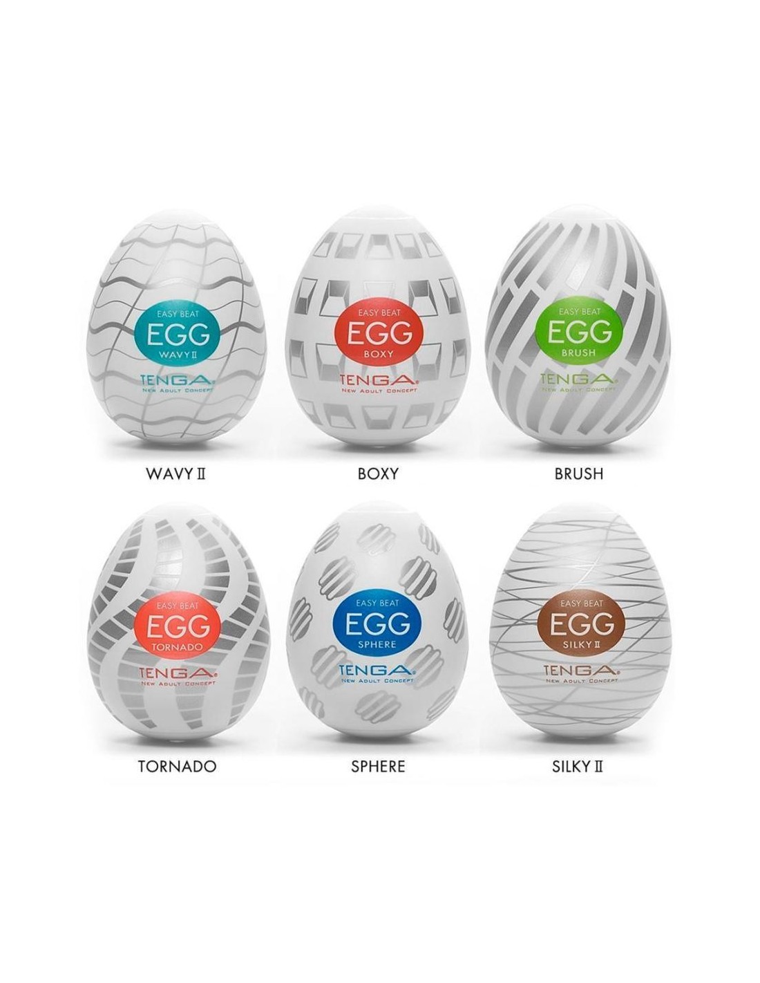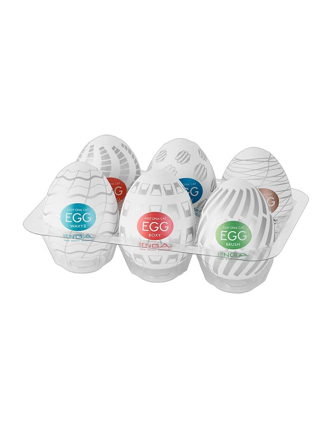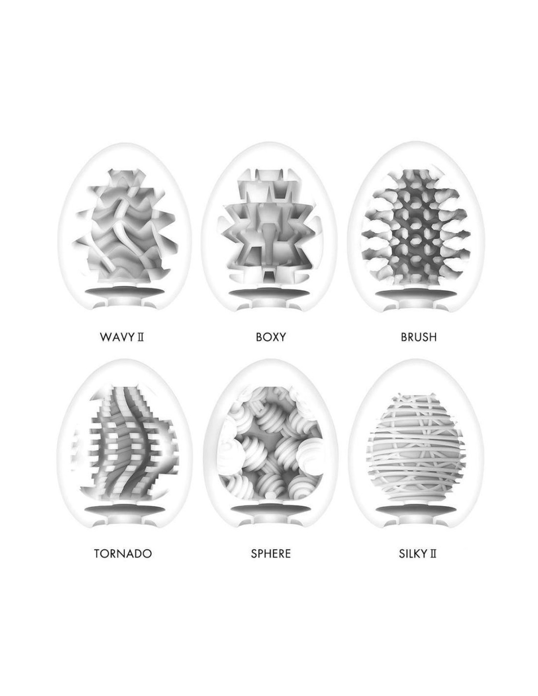 6 masturbatori compatti monouso (ovetti) nel Variety Pack New Standard di TENGA con diverse strutture stimolanti all'interno: Wave II, Boxy, Brush, Tornado, Sphere e Silky II. Le guaine ultra-flessibili del masturbatore si trovano ciascuna nella guaina a forma di uovo e vengono utilizzate insieme durante una sega con il lubrificante incluso.