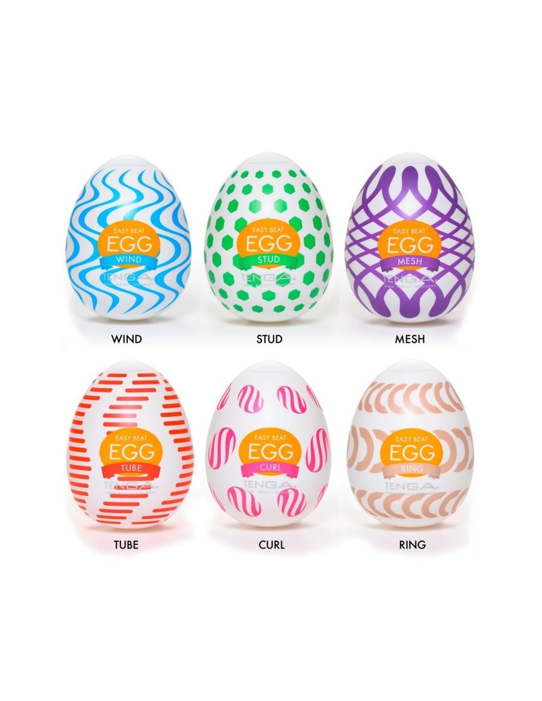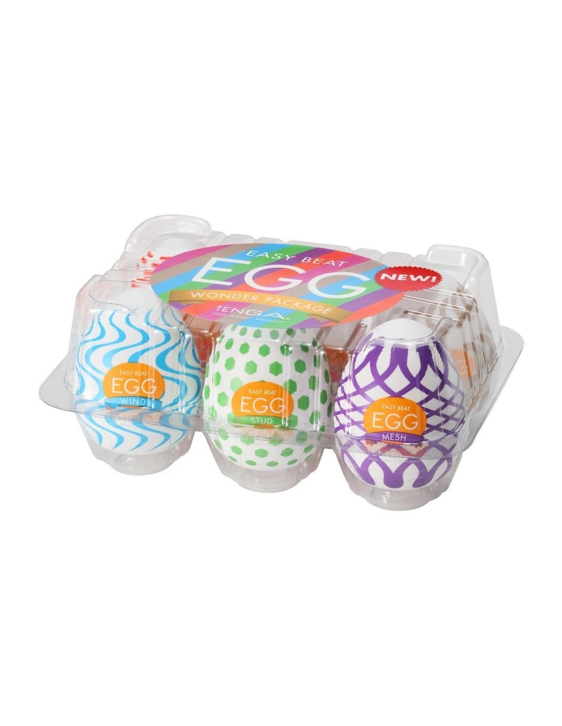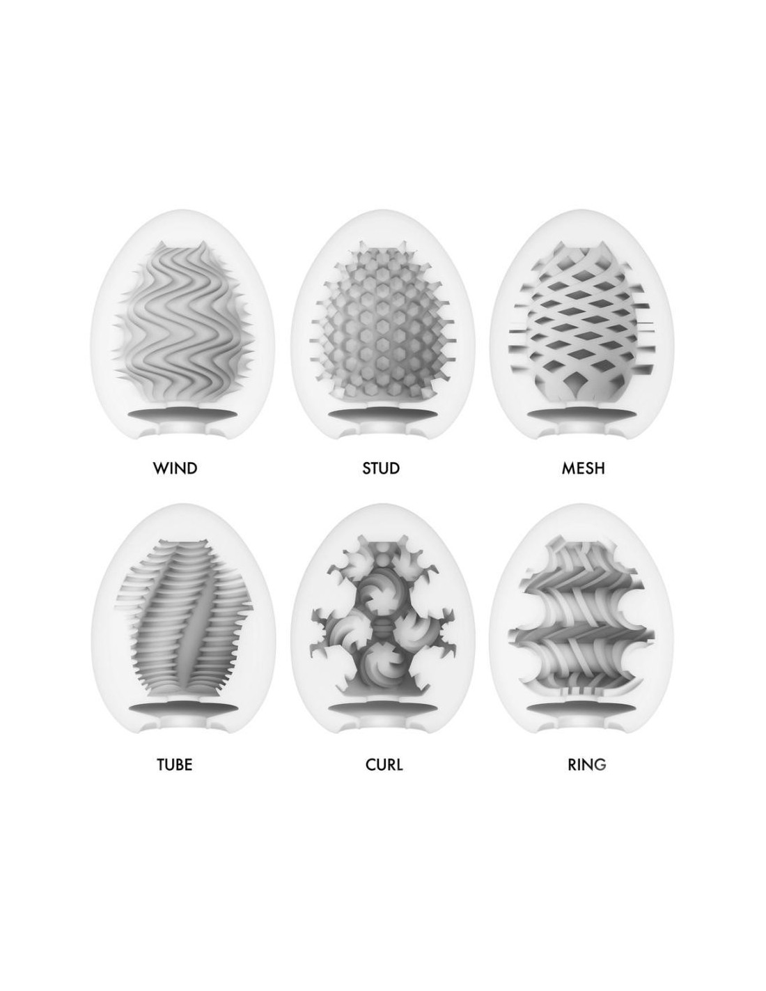 6 masturbatori compatti monouso (ovetti) nella confezione Wonder variety di TENGA con diverse strutture stimolanti all'interno: Wind, Stud, Mesh, Tube, Curl e Ring. Le guaine ultra-flessibili del masturbatore si trovano ognuna nella guaina a forma di uovo e vengono utilizzate insieme durante una sega con il lubrificante incluso.