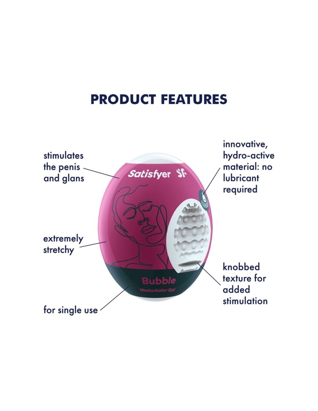 Bubble Egg di Satisfyer è un masturbatore pronto a coccolare come nessun altro prima d'ora. Dentro al guscio duro, si nasconde un manicotto morbido e ricco di nodi stimolanti che conquisterà ad ogni movimento. Grazie al materiale flessibile, l’ovetto è estremamente elastico e perfetto per stimolare il pene in modo unico e coinvolgente.