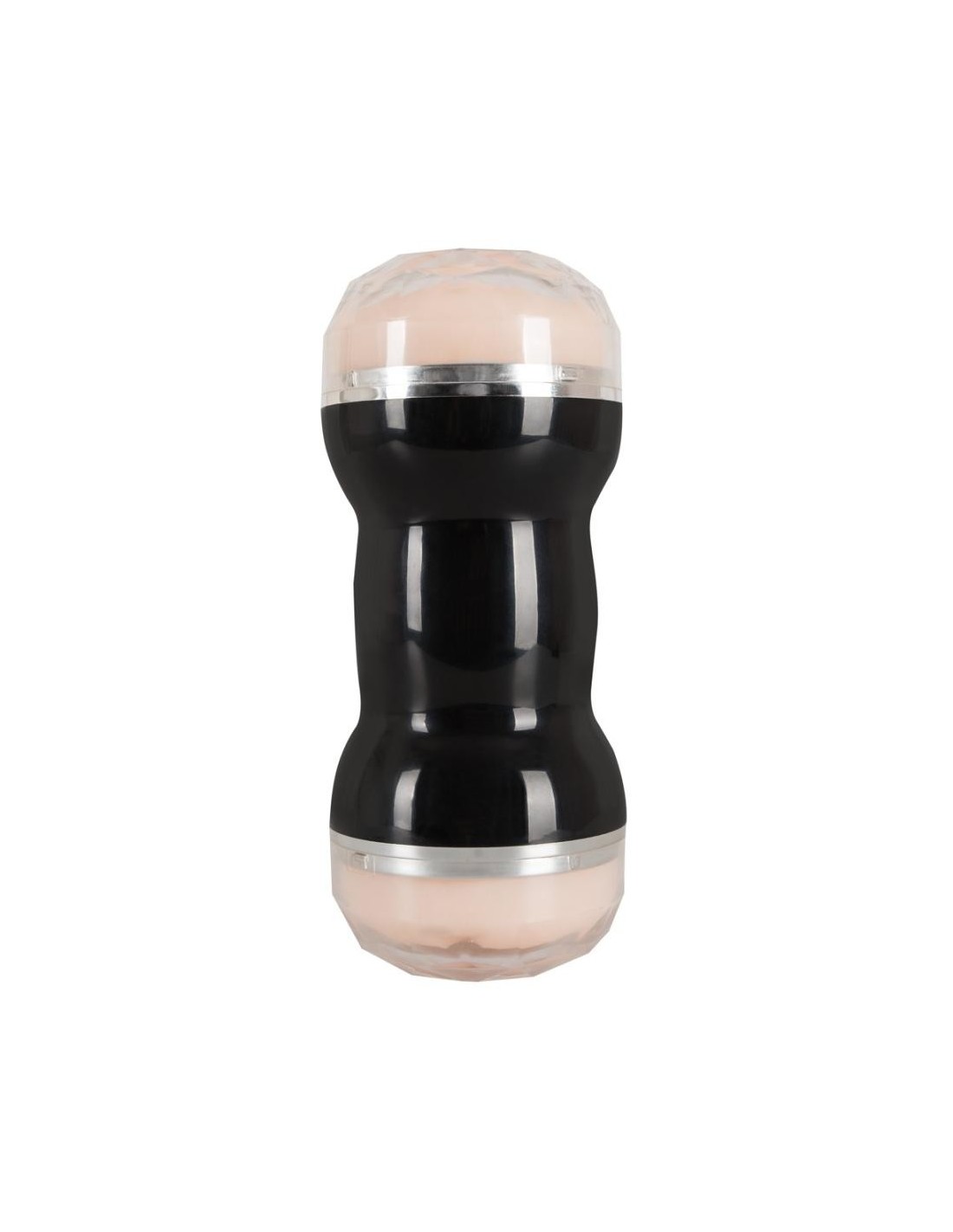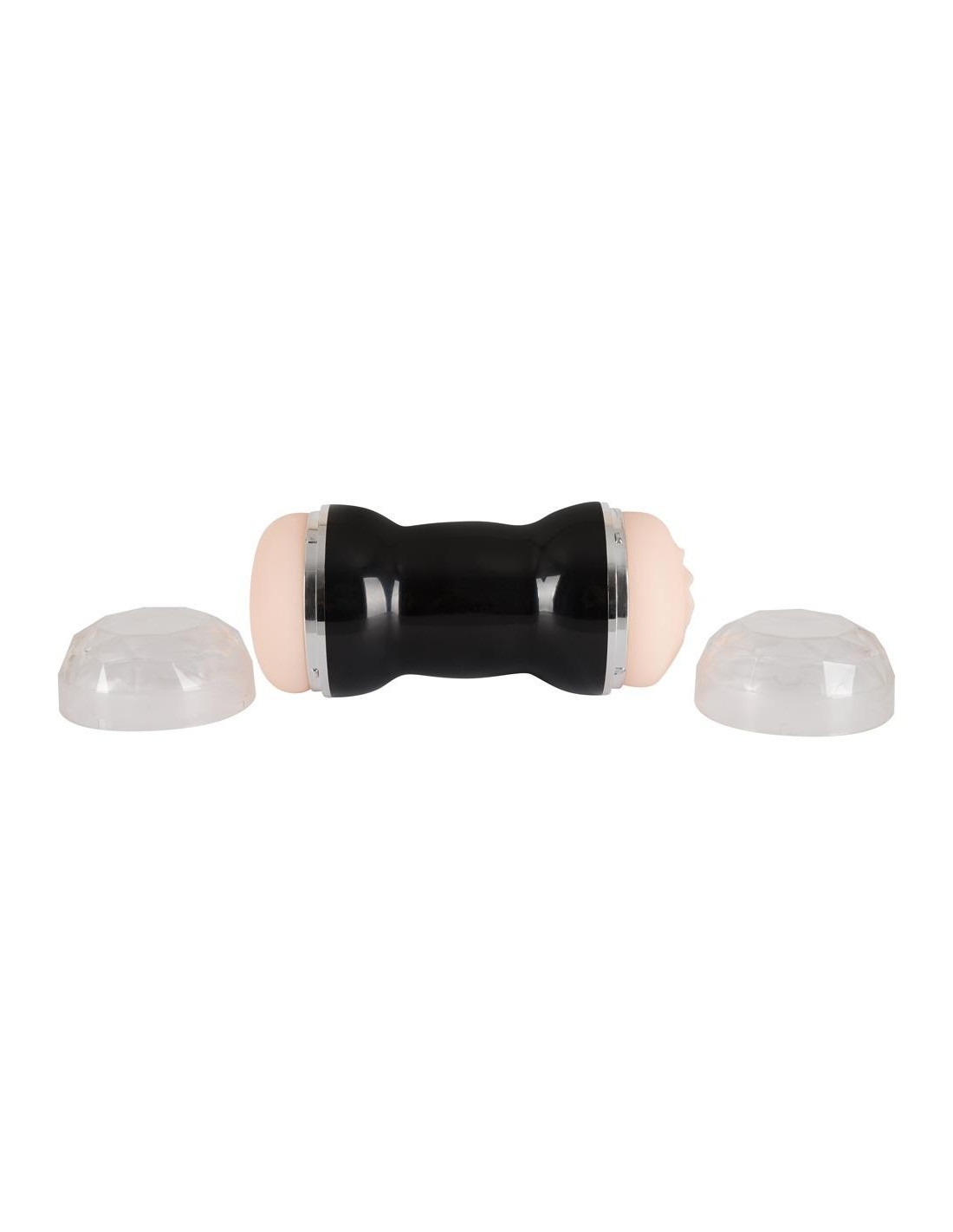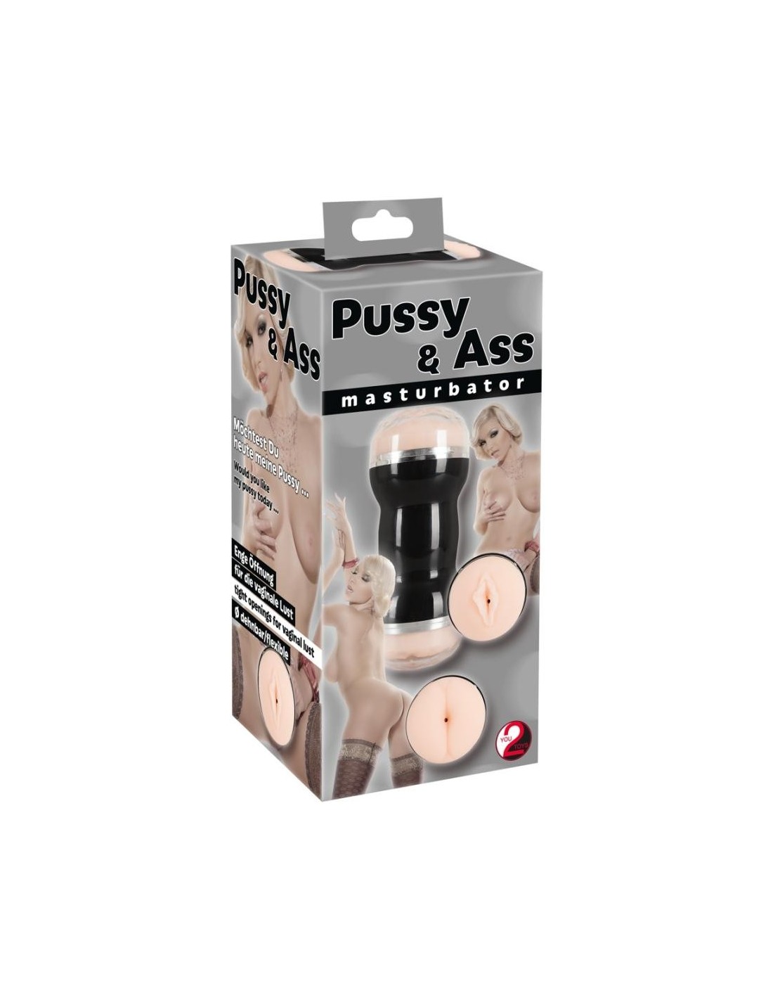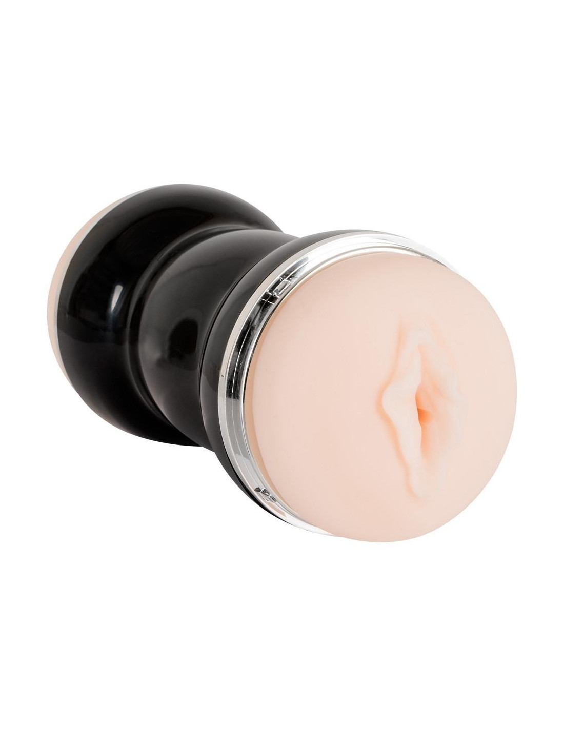 Masturbatore a doppia masturbazione color pelle in involucro nero e argento. Il canale del piacere strutturato è aperto su entrambi i lati - da un lato in forma di vagina, dall'altro in forma di ano. Lunghezza totale 20 cm, O̸ interno ca. 4 cm. Si consiglia l'uso di un lubrificante. Il canale del piacere può essere estratto dalla lattina per la pulizia. Materiale: TPR, coperchio ABS.