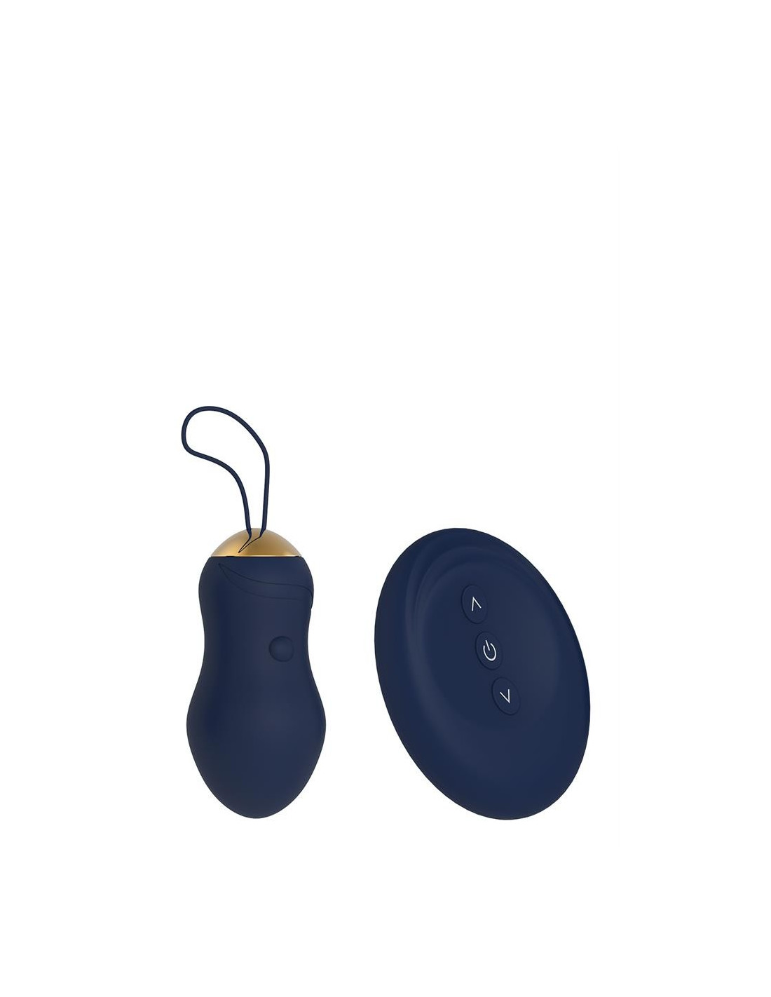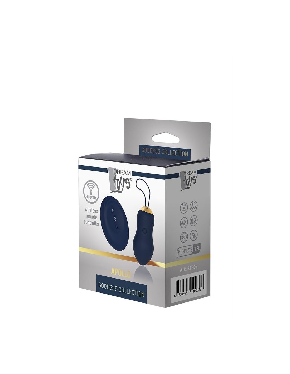 Apollo is a vibrating egg with a remote control. Great for internal stimulation with easy operation and a strong draw string for easy retrieval.&, nbsp,The Apollo egg has a sophisticated look thanks to the smooth shape, dark blue silicone and gold coloured detail. This pleasure egg offers 7 vibration rhythms in 3 speeds, so there's always a vibration to suit the users needs. The vibes can be easily adjusted during use with the arrow buttons on the wireless remote control that has a 10 meter reach. Both the egg and the remote are rechargeable with the included USB-pin cable.