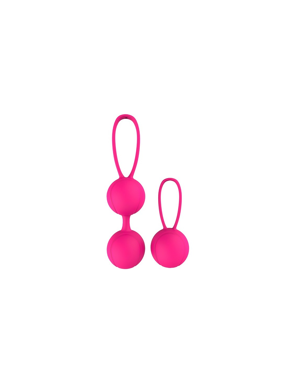 A set of small pleasure balls to place in the vagina. The encapsulated steel balls can move freely and provide an intense pleasure and at the same time they are an ideal training for your pelvic floor muscles. These kegel balls are made of durable silicone and easy to clean. One consists of 1 ball on a draw string, the other one is made of 2 attached balls on a draw string.