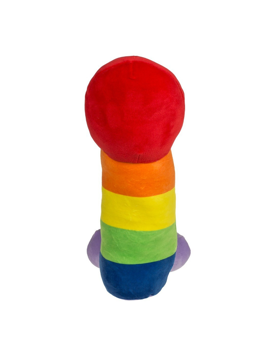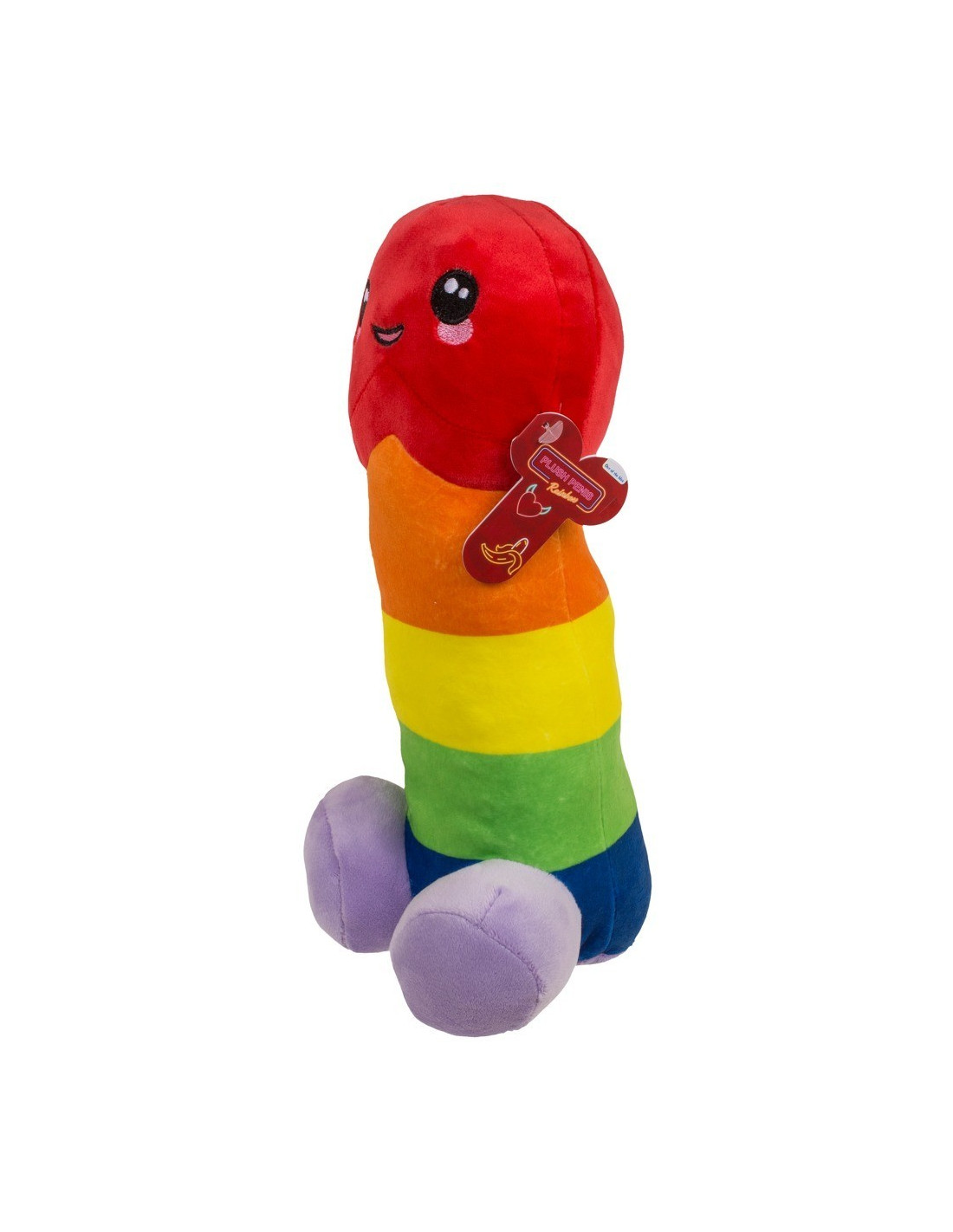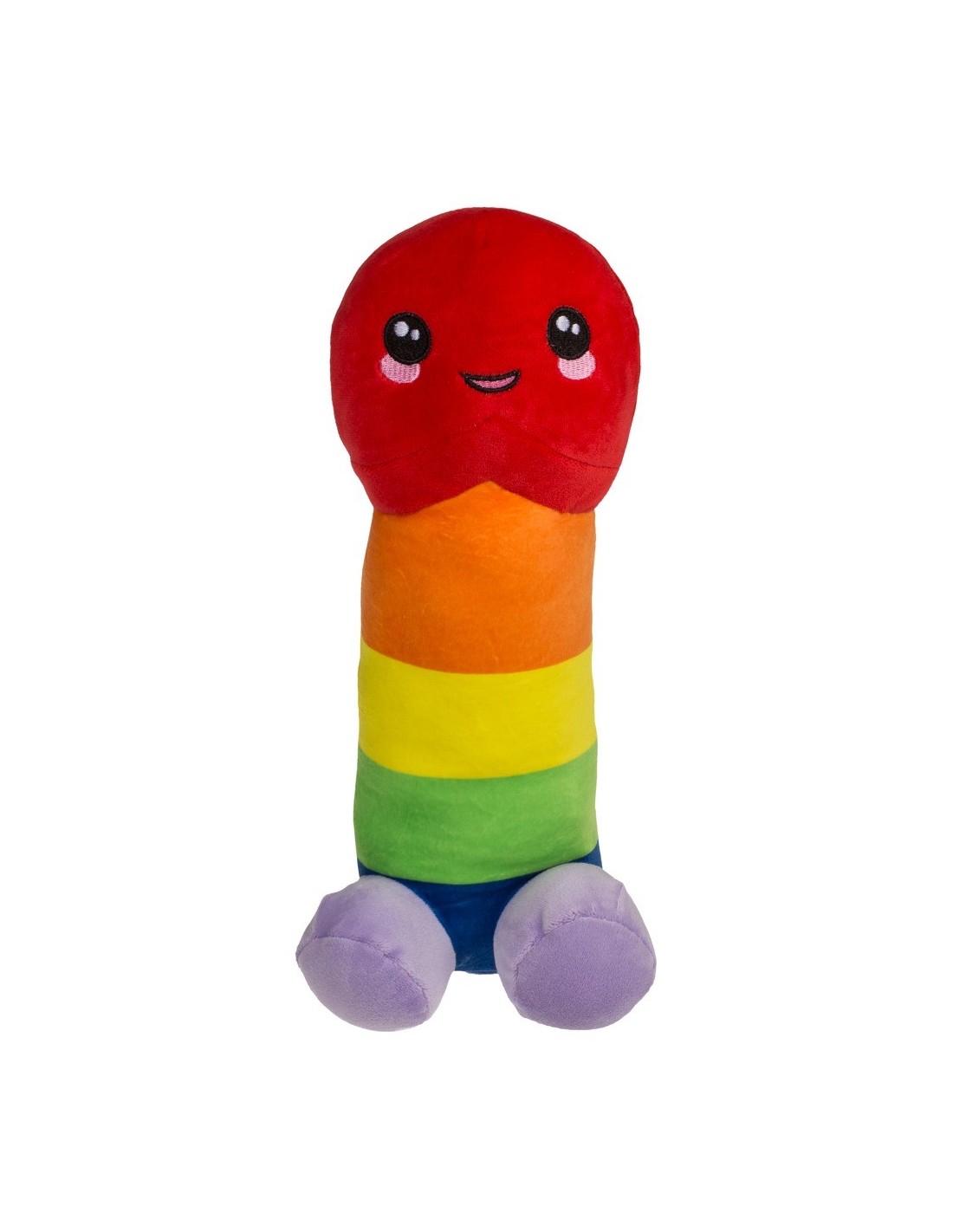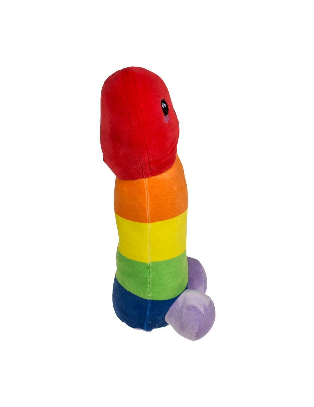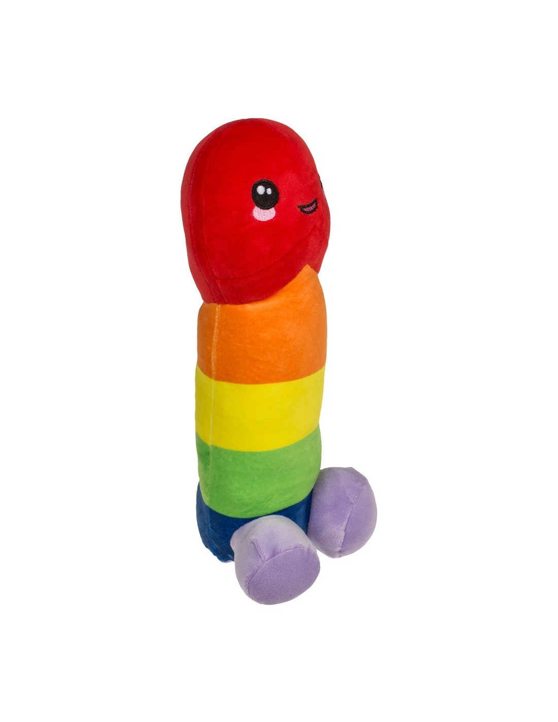 Simpatico e colorato pene di peluche nei colori dell'arcobaleno. Con bocca e occhi sorridenti ricamati sul glande. Sta in piedi o seduto sui suoi testicoli sferici di peluche. Morbido e soffice, ben riempito e con una superficie morbida e vellutata.