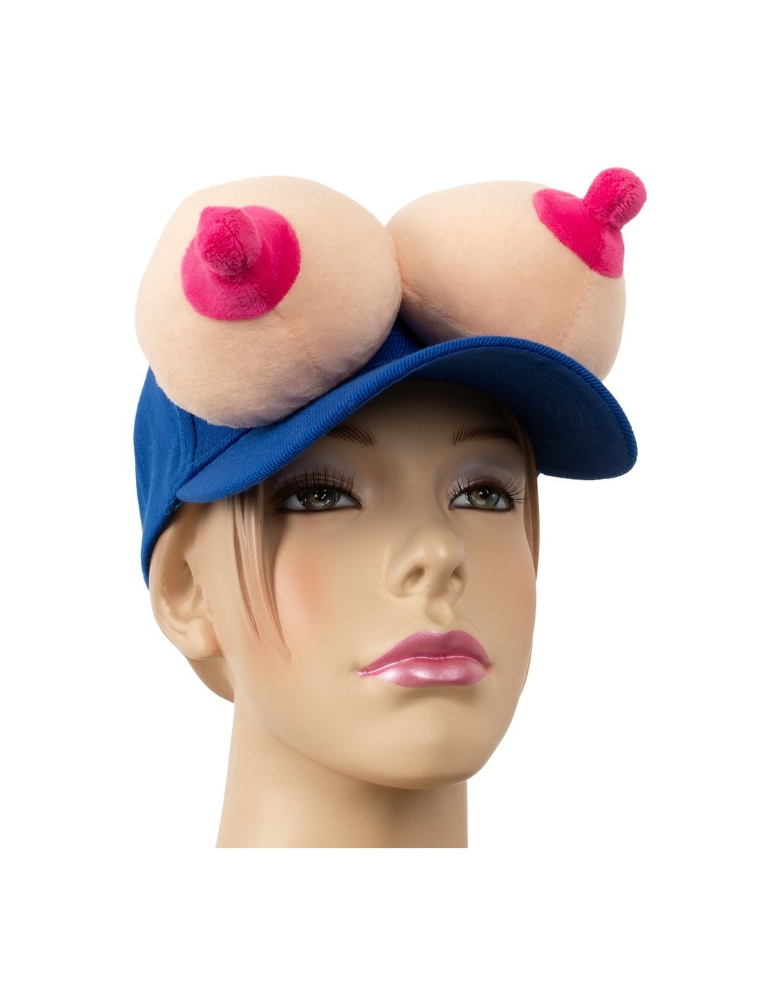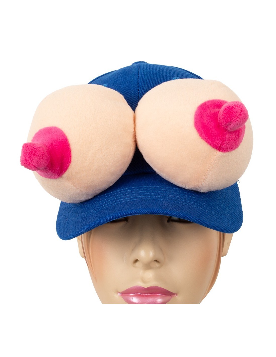 Elegante cappellino da baseball blu con un paio di seni di velluto in contrasto di colore sopra la visiera fissa. Sfacciato e audace per carnevale, feste a tema, JGA, festival, ecc. Berretto con chiusura a scatto, circonferenza della testa regolabile.