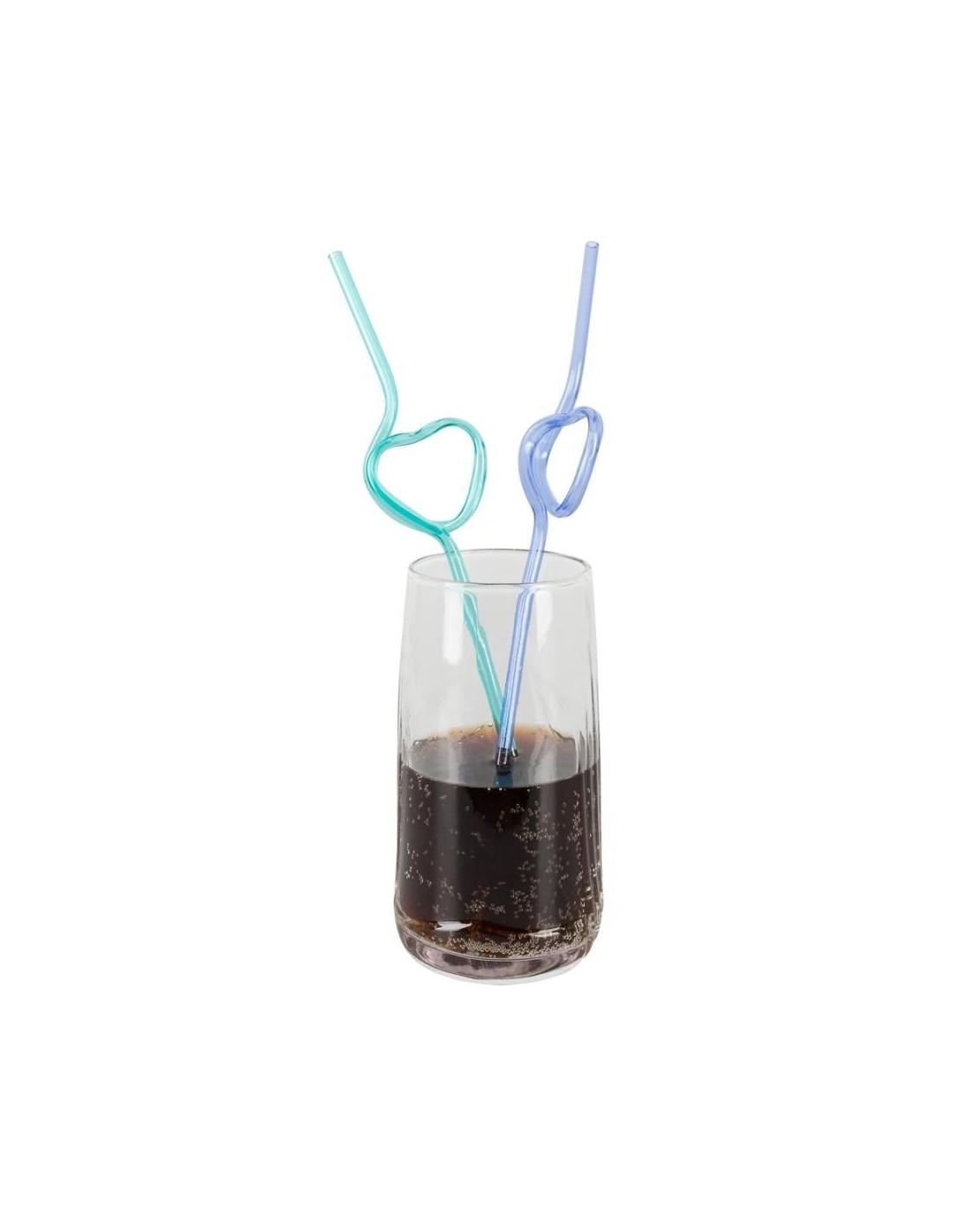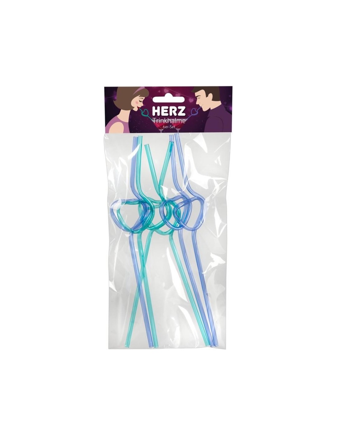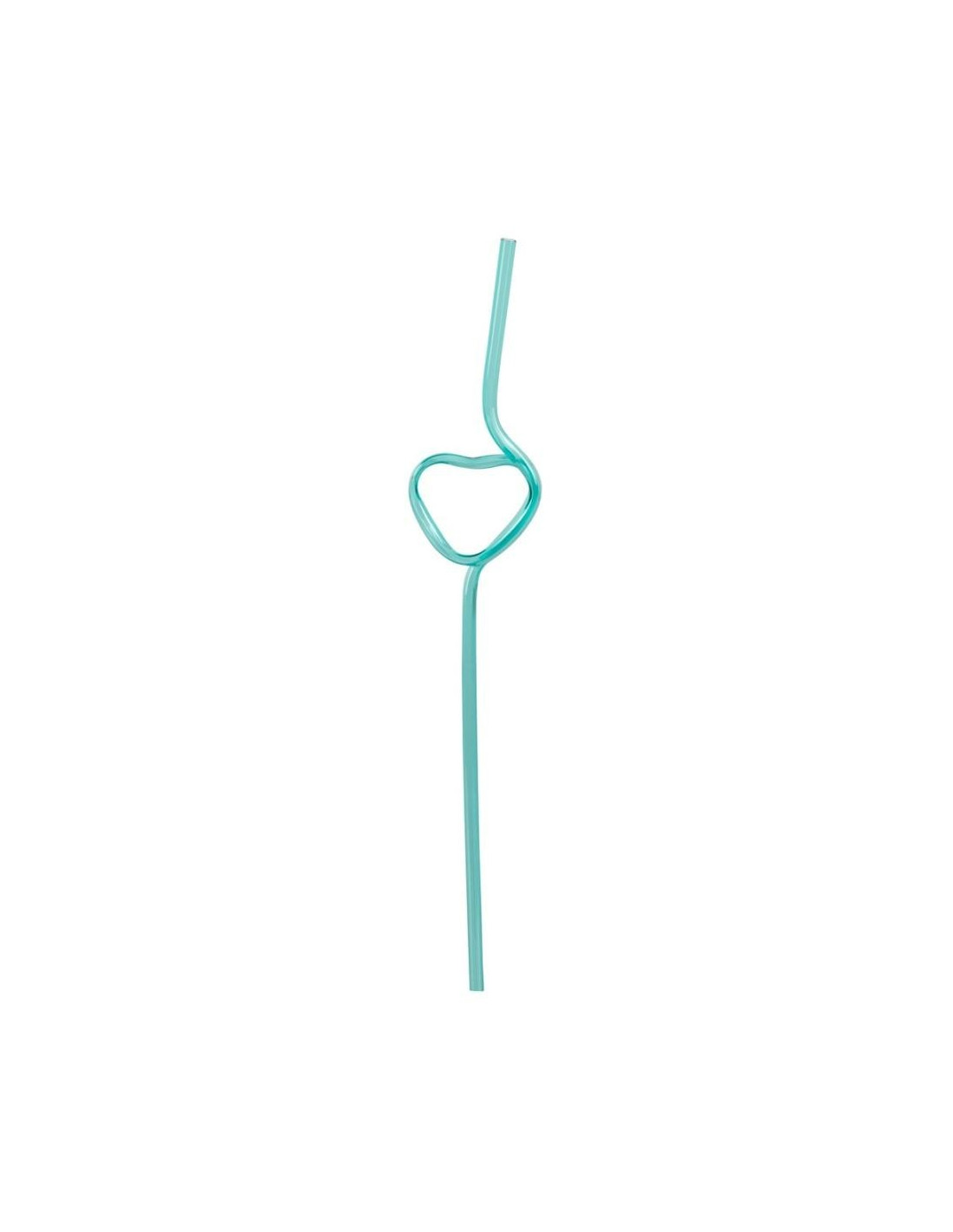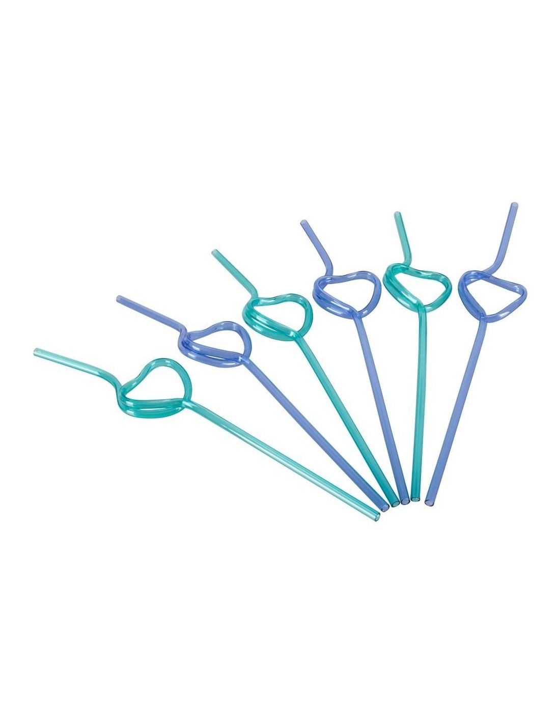 The top third of the straw is in a heart shape. There are 6 straws in a pack (3 turquoise, 3 x purple). Each straw is 22.5 cm long. PETG.