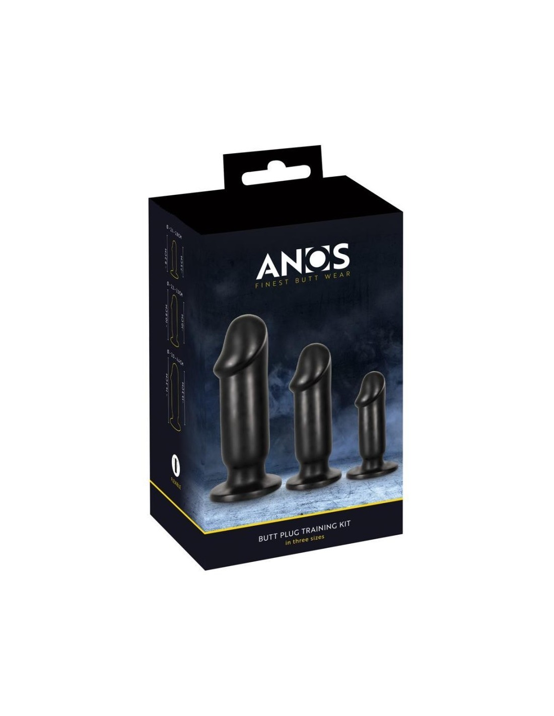 Butt Plug Training Kit di ANOS con 3 plugs anali di diverse dimensioni e pesi per una stimolazione eccitante e un perfetto allenamento all'allungamento delle natiche. Ogni plug flessibile ha un glande modellato e una grande base di aspirazione per un'azione anale sicura (permanente) senza scivolare e senza mani.