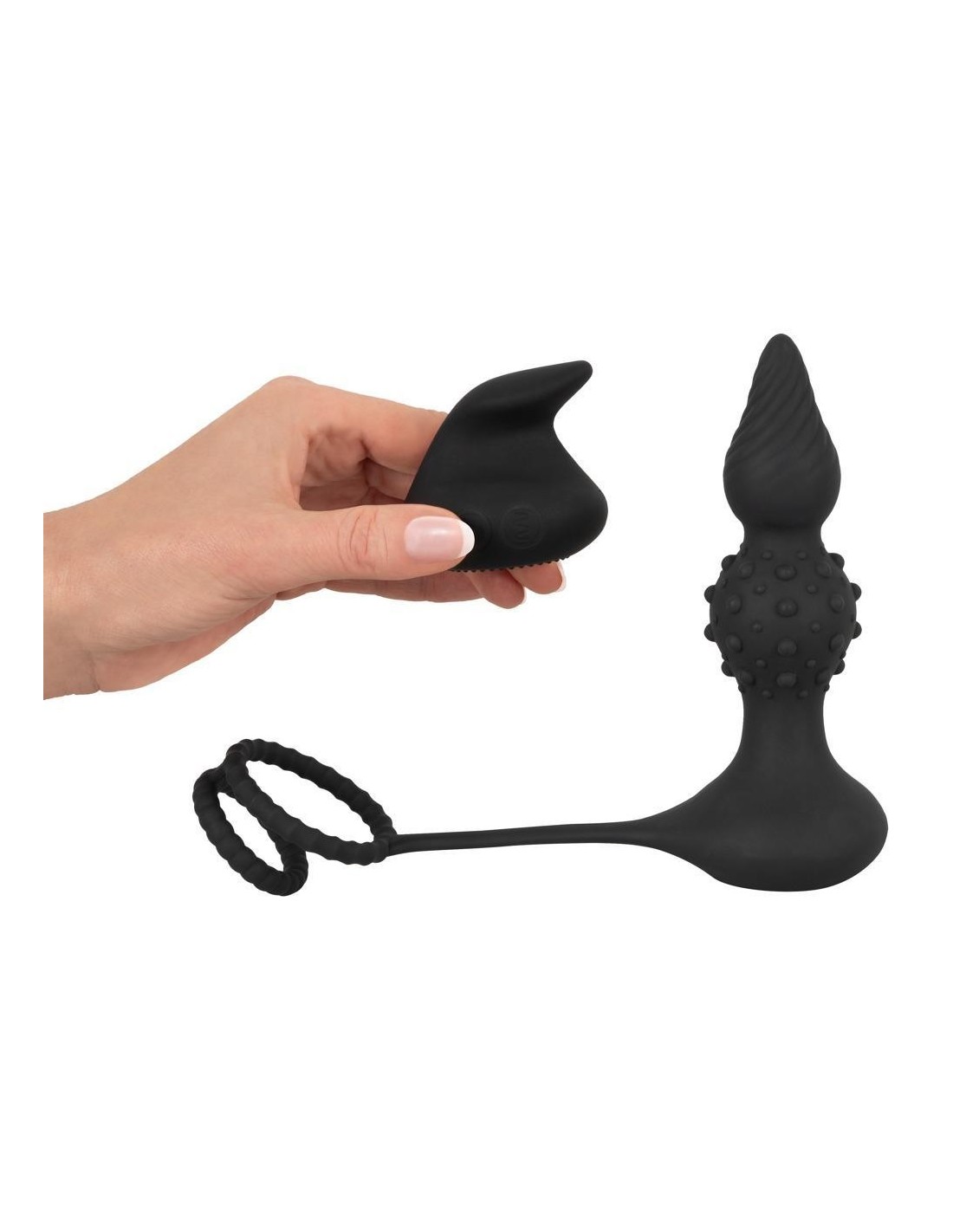 Gli anelli afferrano saldamente il pene e i testicoli e possono sostenere efficacemente l'erezione grazie all'effetto di stasi del sangue. Allo stesso tempo, il plug vibro-anale inserito, con il suo speciale design a nodi e scanalature e 10 diverse modalità di vibrazione, fornisce un'intensa stimolazione nella parte posteriore del pene. La barra di connessione flessibile si annida vicino al perineo e fornisce una stimolazione aggiuntiva.