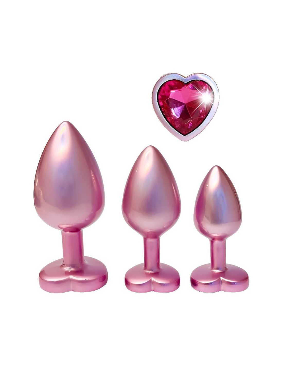 The Gleaming Love collection presents this set of pink pearl-finished anal plugs in 3 sizes, each with a gem stone. Made of smooth lightweight aluminium and seamless, these pleasure toys are easy to glide and the flared base ensures a sense of security while keeping the jewel sitting comfortably between the butt cheeks.