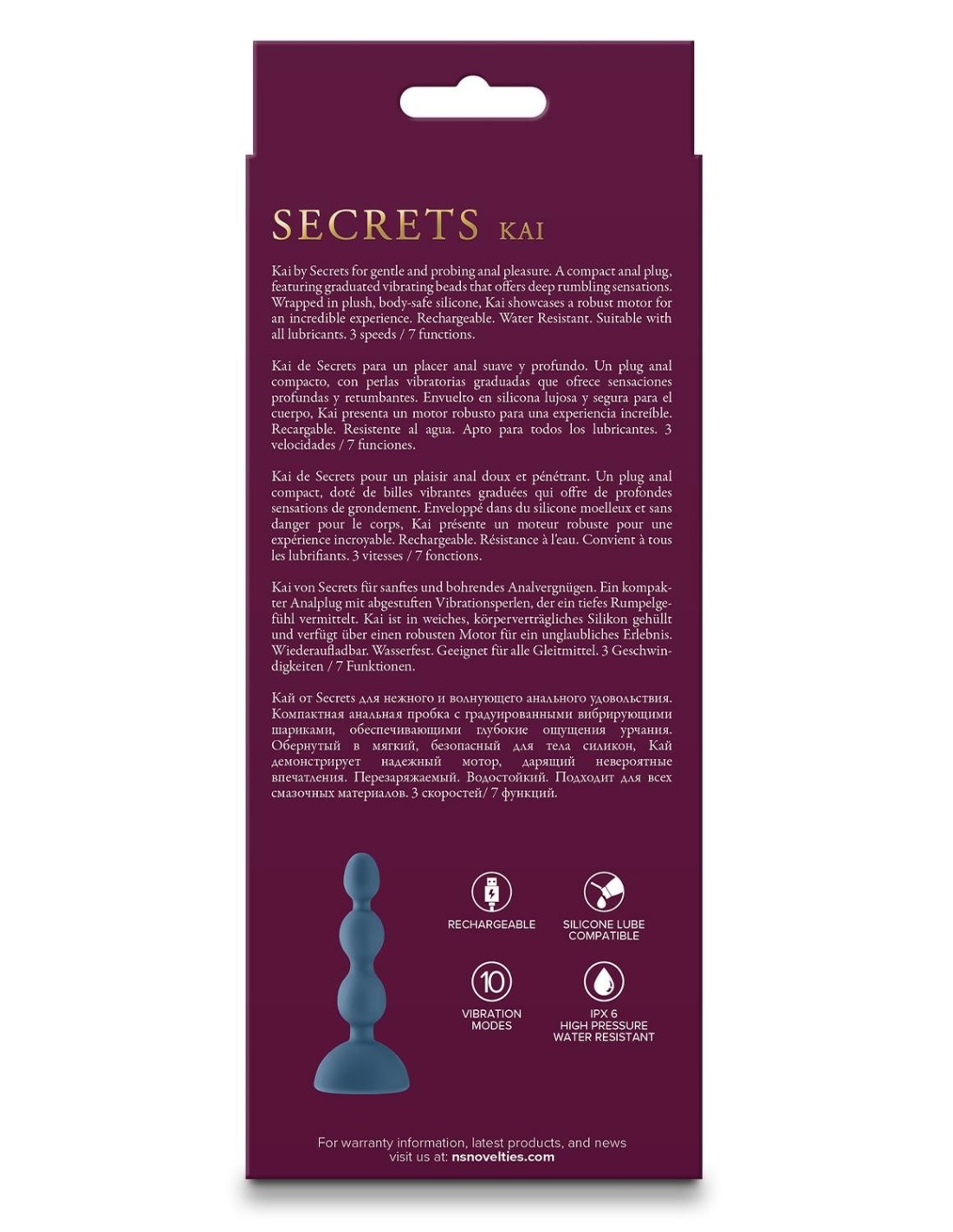 Elevate your anal play with Kai by Secrets, a compact anal plug designed for gentle yet thrilling pleasure. Featuring graduated vibrating beads wrapped in plush, body-safe silicone, Kai delivers deep rumbling sensations for an incredible experience. With 3 speeds and 7 functions, this rechargeable, water-resistant plug allows for a customized exploration of anal pleasure. Compatible with all lubricants, Kai ensures both safety and satisfaction in every encounter.