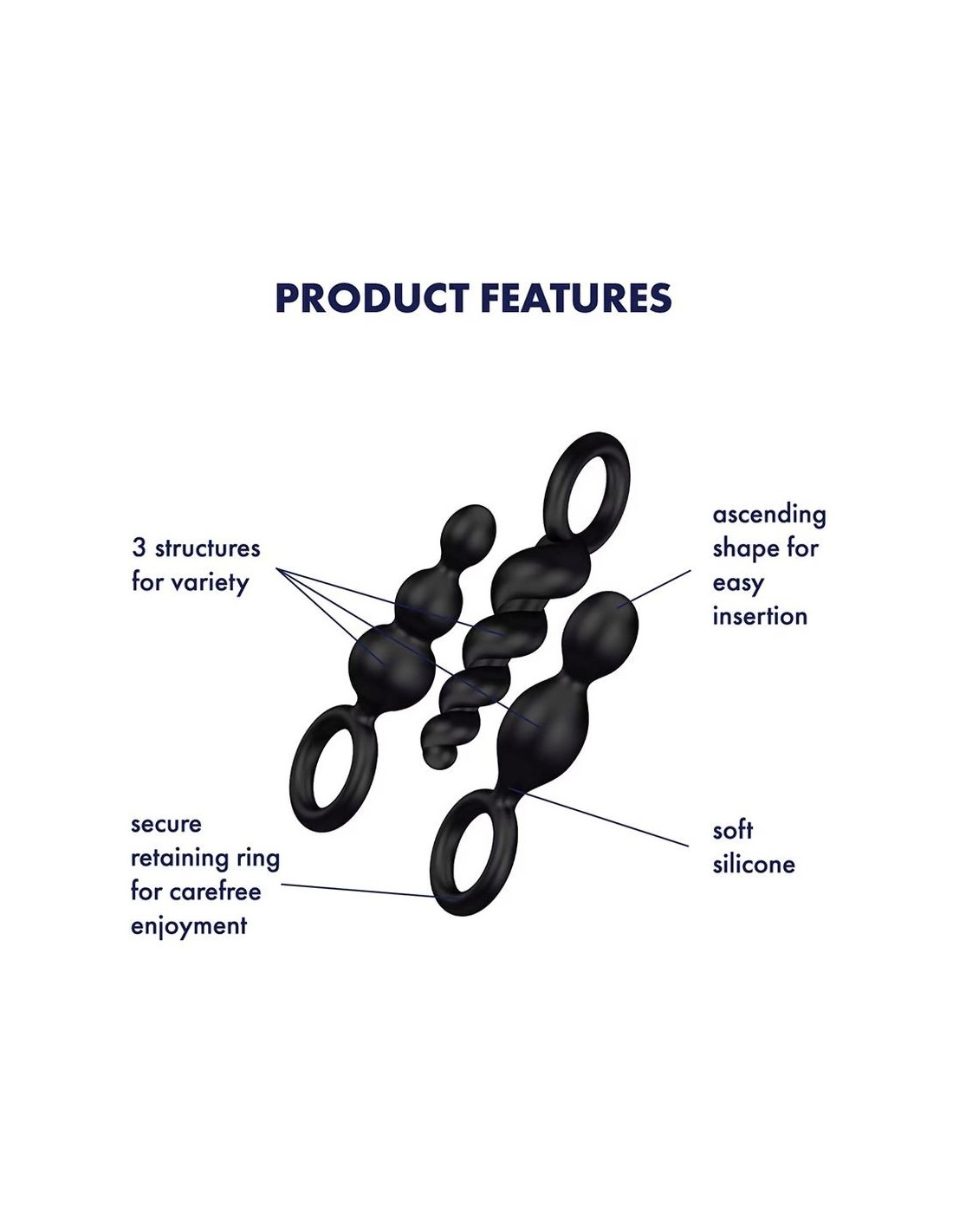 Con 3 diverse strutture, il set Booty Call di Satisfyer è ideale per i principianti nell'allenamento anale. I plug anali hanno un diametro crescente, quindi l'ano viene allargato delicatamente in modo che tu possa preparare l’orifizio anale all’azione. I plug sono difficili da battere in termini di versatilità: puoi scegliere tra un design a spirale attorcigliata, una forma conica stretta e la classica struttura sferica con 3 elementi. Tutti e 3 i design colpiscono con una superficie liscia ed elastica in morbido silicone igienico e delicato sulla pelle. Il pratico anello di sicurezza semplifica l'inserimento del prodotto e ne garantisce un facile utilizzo. Inoltre, agisce come un'ampia base che impedisce il completo inserimento del plug nell’ano, così puoi dedicarti al tuo allenamento senza preoccupazioni.
