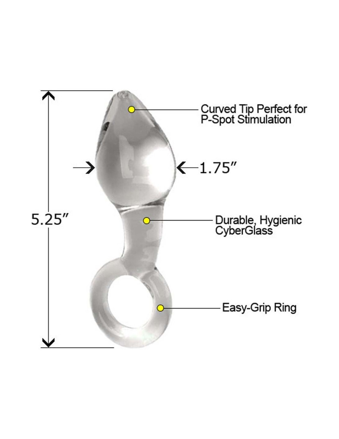 Colpisci il punto giusto! CyberGlass P-Spot 3,75 pollici inseribili (9,5 cm.) La punta affusolata è facile da inserire, il bulbo angolato prende di mira la prostata. Usalo sotto l'acqua calda o fredda: CyberGlass offre brividi sexy o brividi caldi. Riscalda alla temperatura corporea. Impugnatura liscia e robusta. Diventa completamente liscio quando lubrificato. Impermeabile senza ftalati. Igenico. Custodia inclusa. Lunghezza: 9,5 cm. Diametro max.: 4,5 cm
