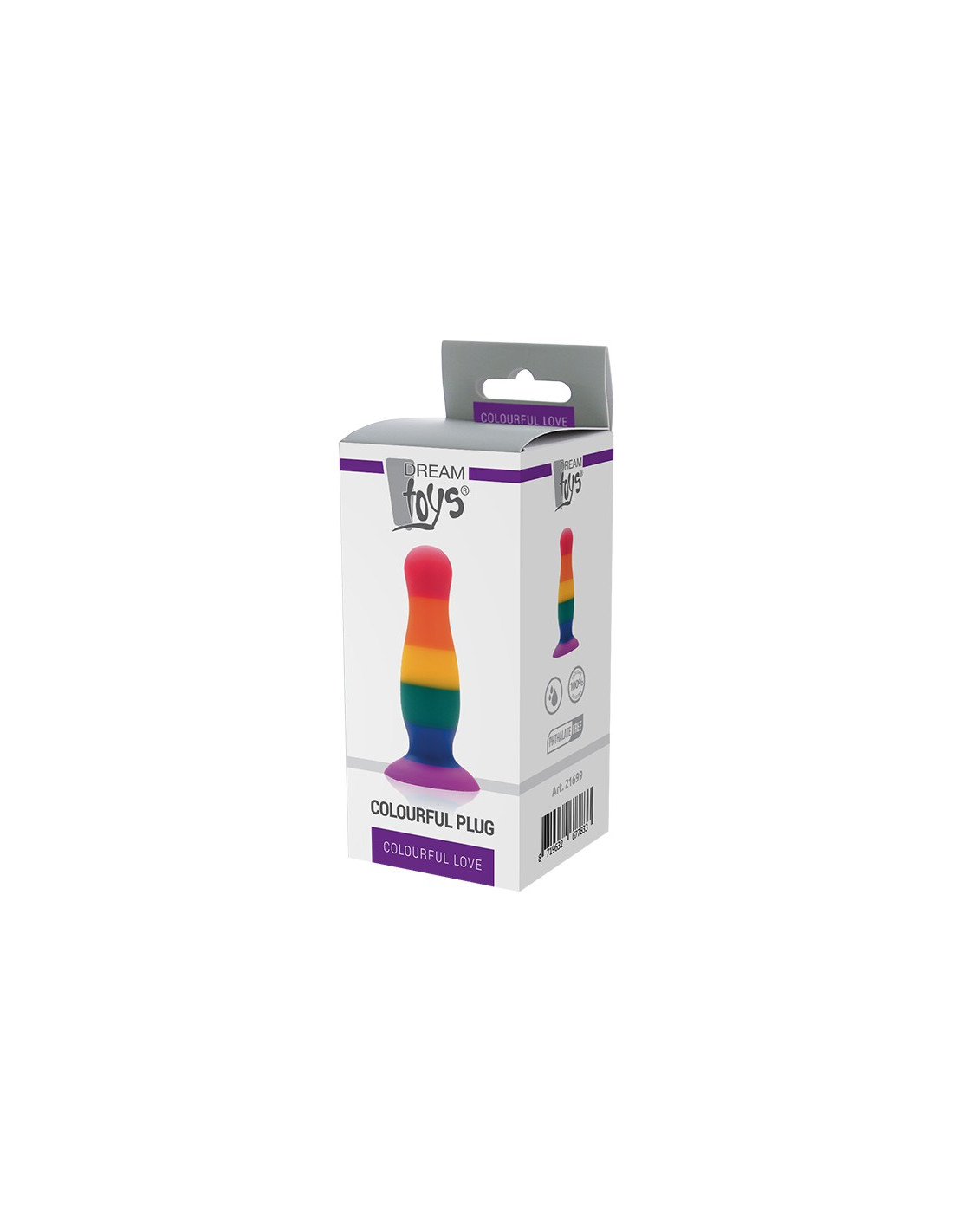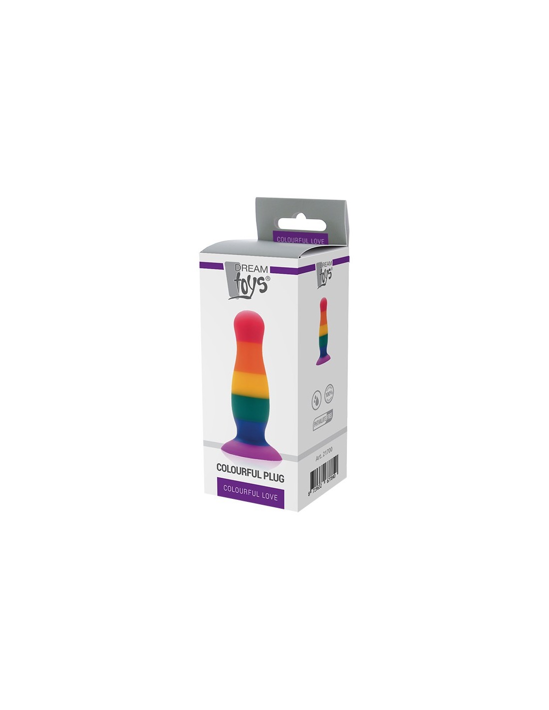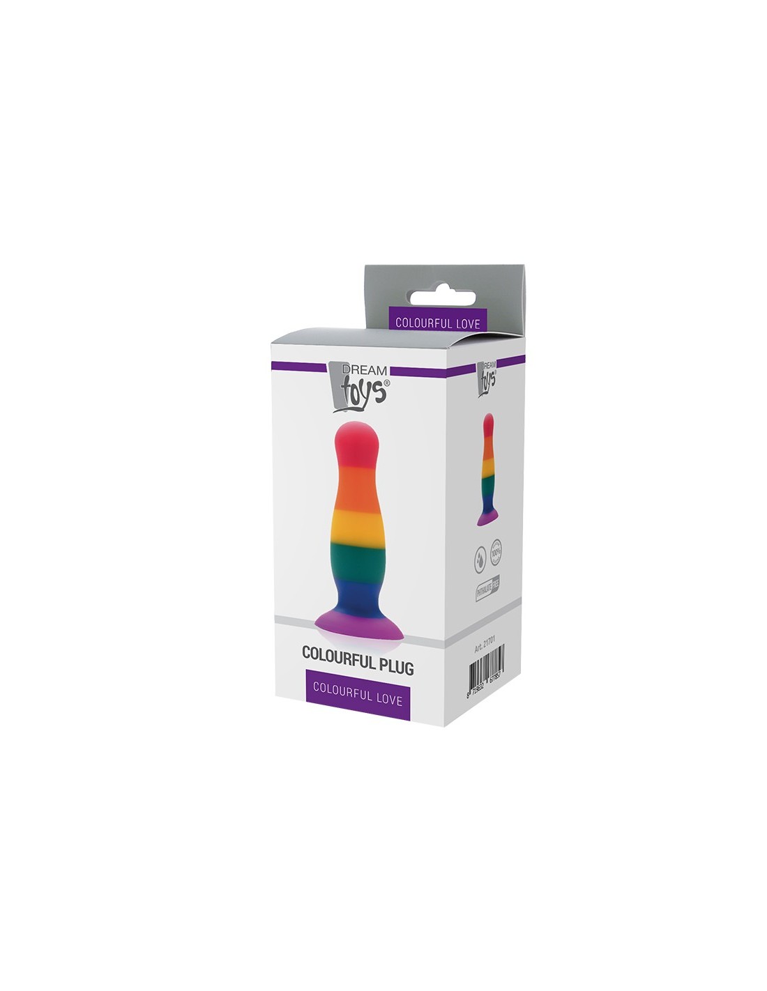 Colourful Love Anal plug made of liquid silicone, which is soft and phthalate free, with rainbow Pride colours and a suction cup base that sticks firmly to any flat, smooth surface. ,