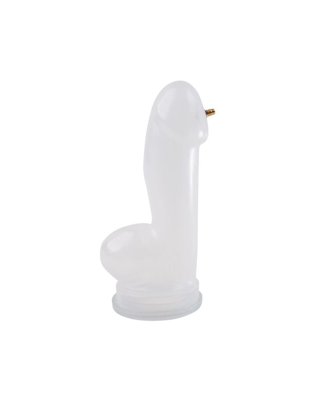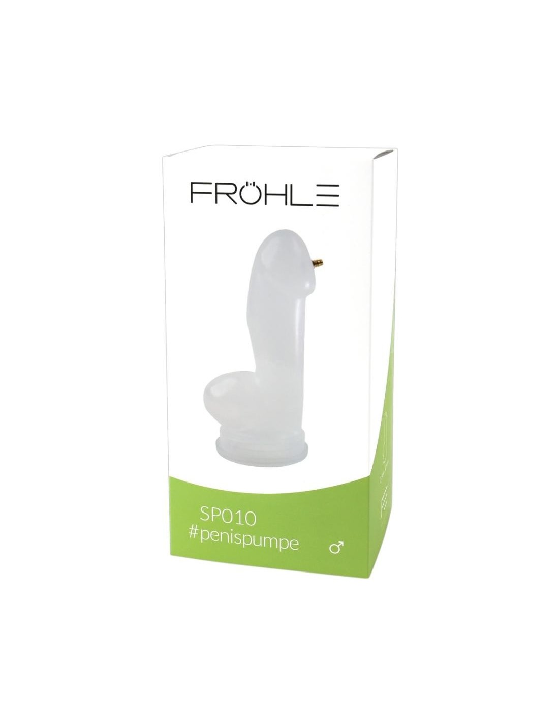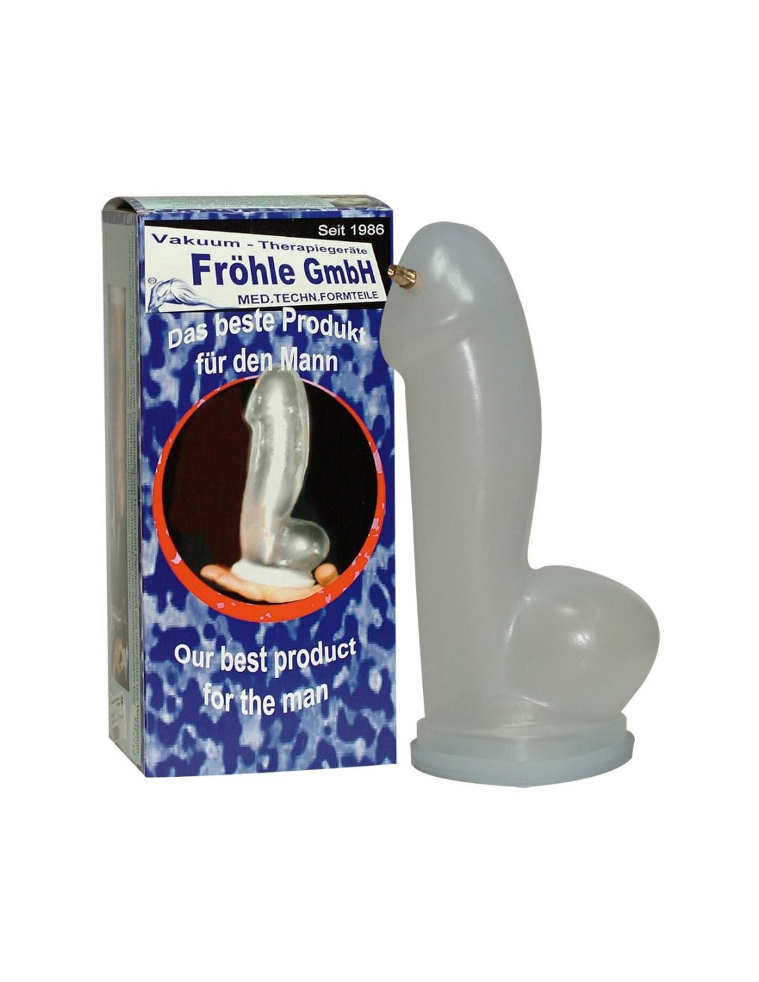 SP010 Cilindro realistico per pene XL trasparente di Fröhle con attacco superiore. A forma di pene anatomico flessibile - alloggia anche i testicoli nel cilindro di aspirazione. Può essere utilizzato in combinazione con una pompa per vuoto Fröhle (incl. tubo di collegamento e regolatore di pressione). Include un manicotto a innesto in PVC (sostituibile).