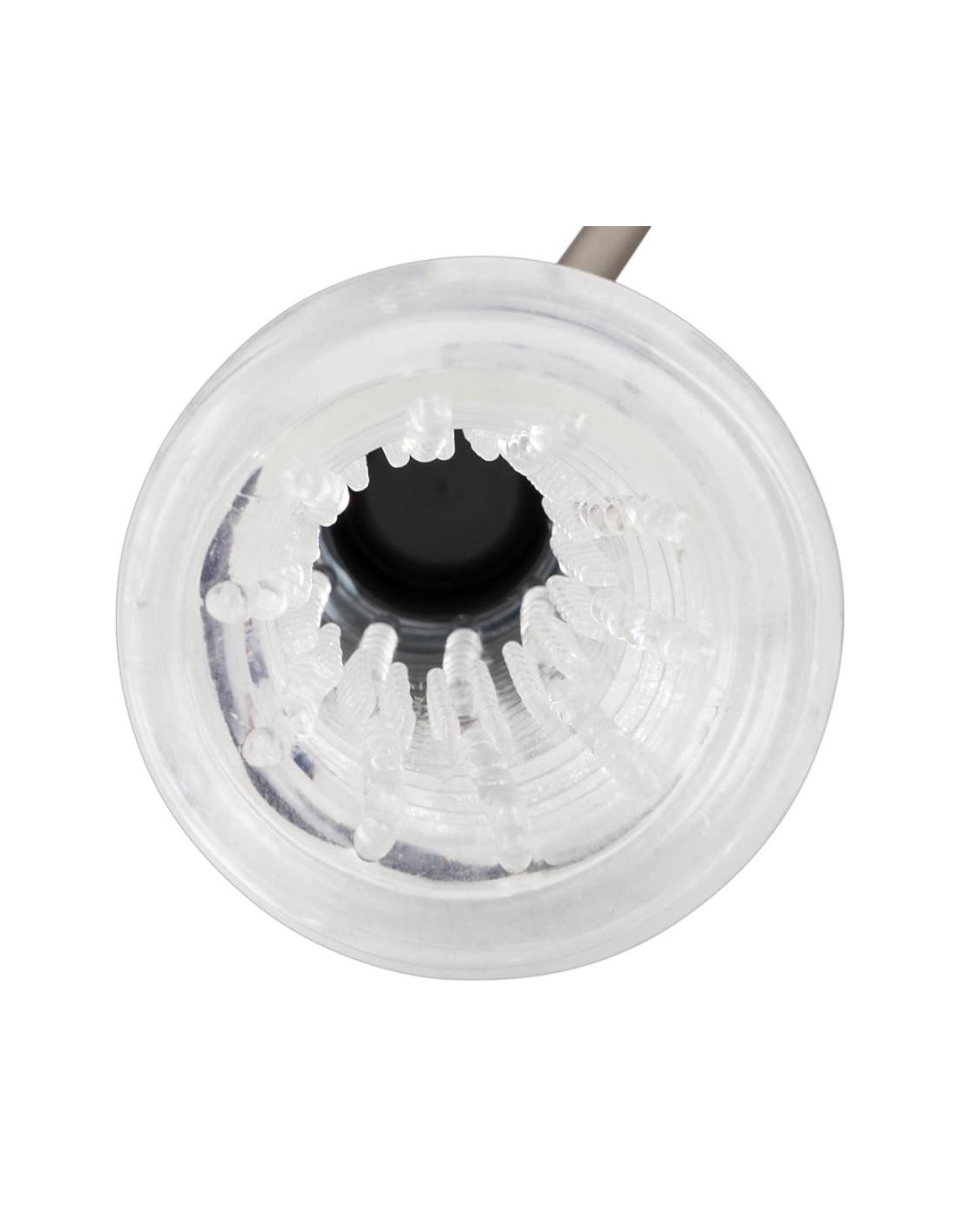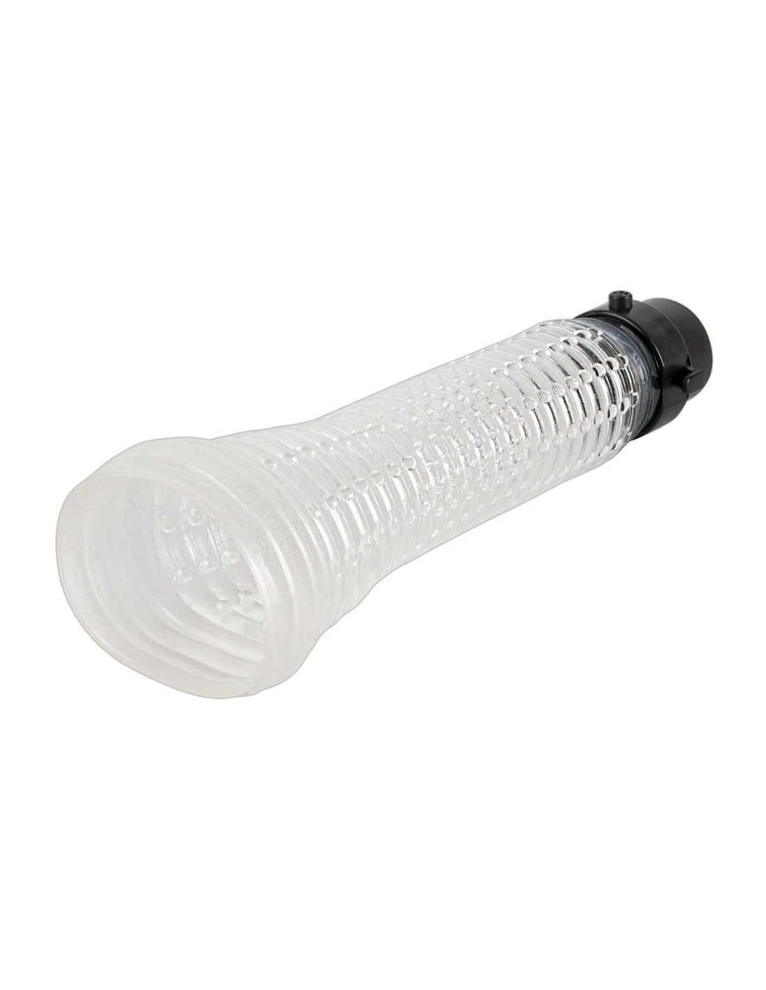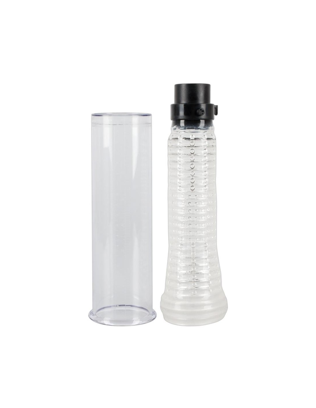 Cilindro trasparente profondo 17,2 cm, O̸ esterno 6 cm, interno con manicotto rimovibile. Lunghezza totale 33,7 cm. SAN, TPR, ABS, gomma, silicone.