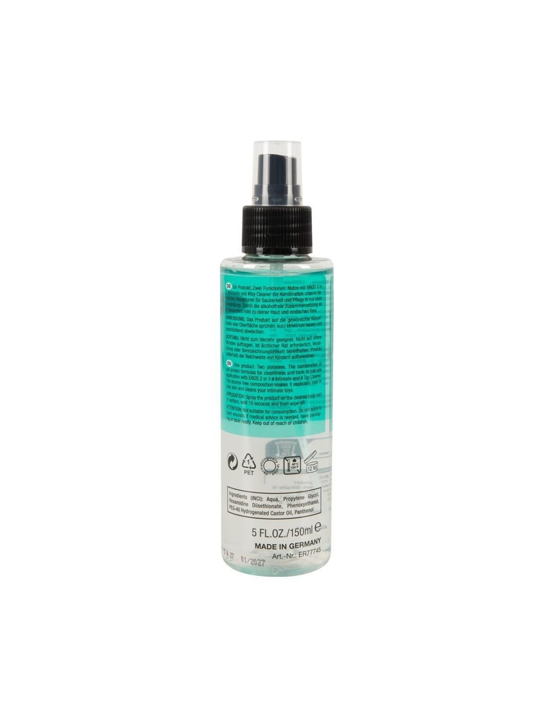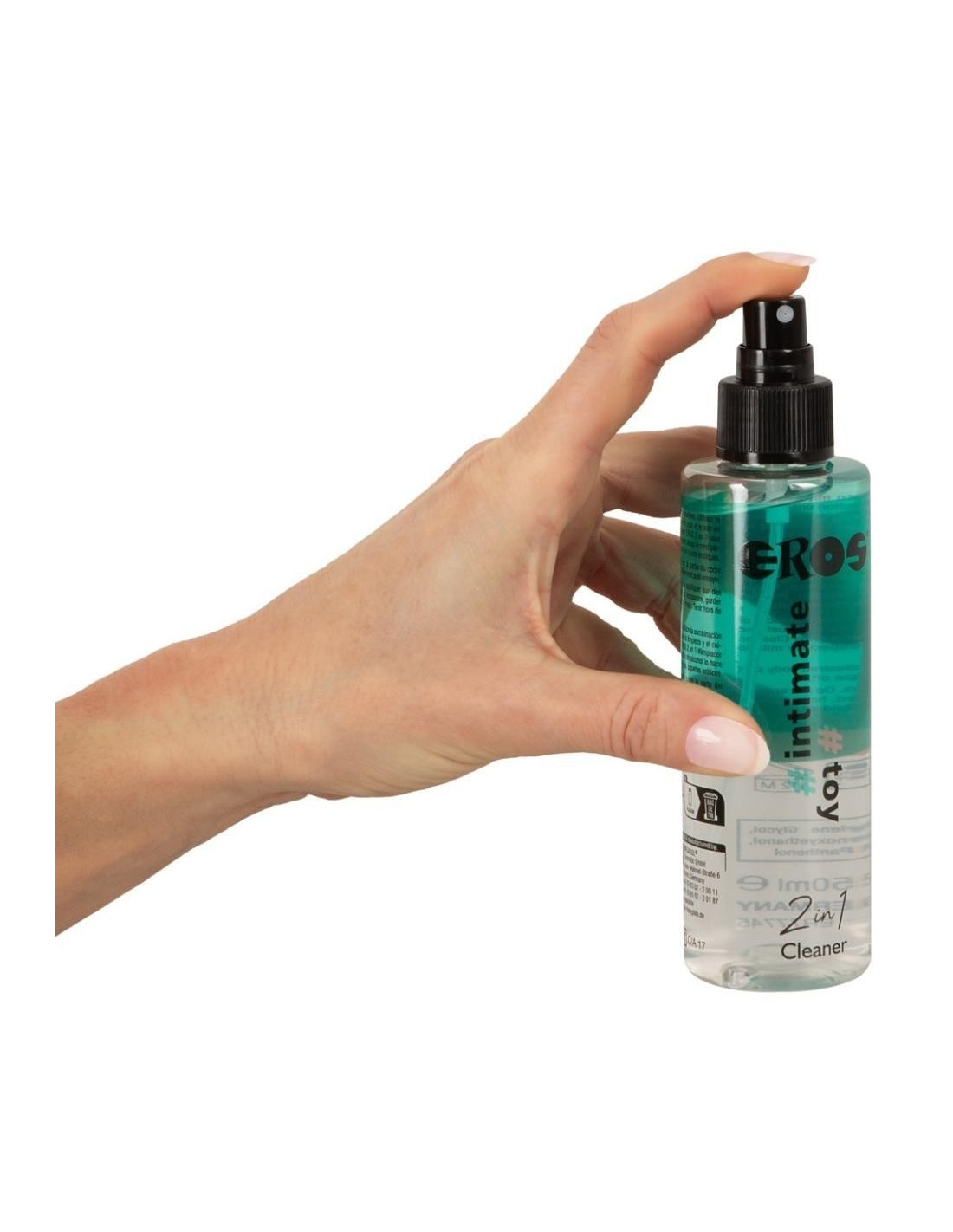 Spray detergente intimo e per giocattoli non profumato di EROS per la pulizia e la cura in una sola applicazione. La formula senza alcool è particolarmente delicata sulla pelle e sui materiali dei giocattoli. Basta spruzzare sulla parte del corpo o sulla superficie desiderata, lasciare agire brevemente e poi strofinare.