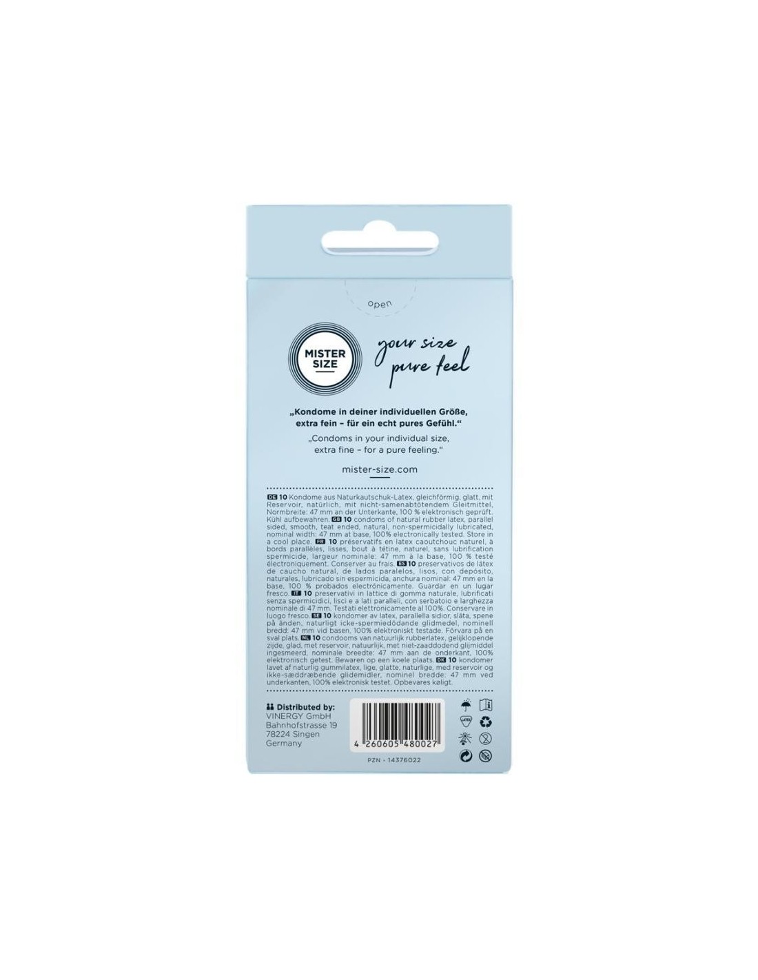 Preservativi Mister Size trasparenti e sottili (47 mm) in lattice di gomma naturale con rivestimento lubrificante e serbatoio. Vegani.