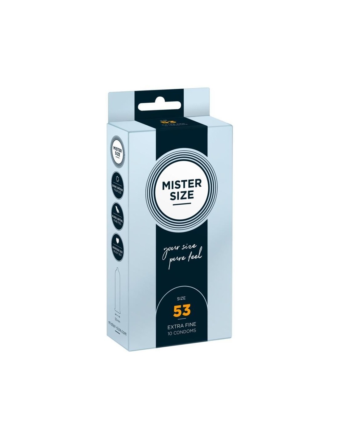 Preservativi Mister Size trasparenti e sottili (53 mm) in lattice di gomma naturale con rivestimento lubrificante e serbatoio. Vegani.