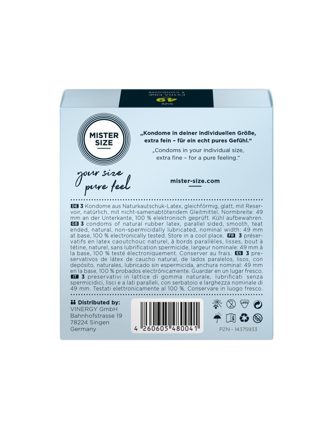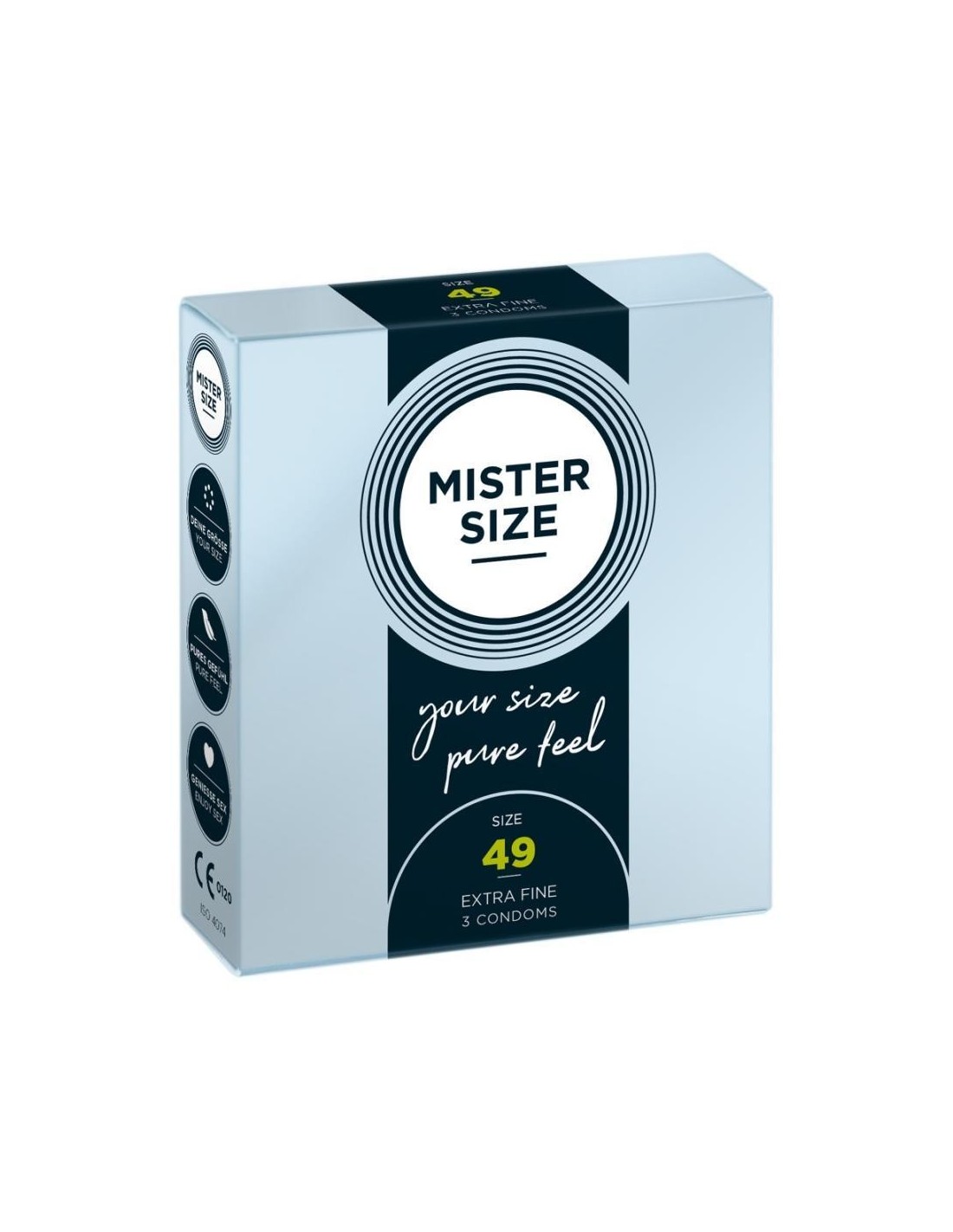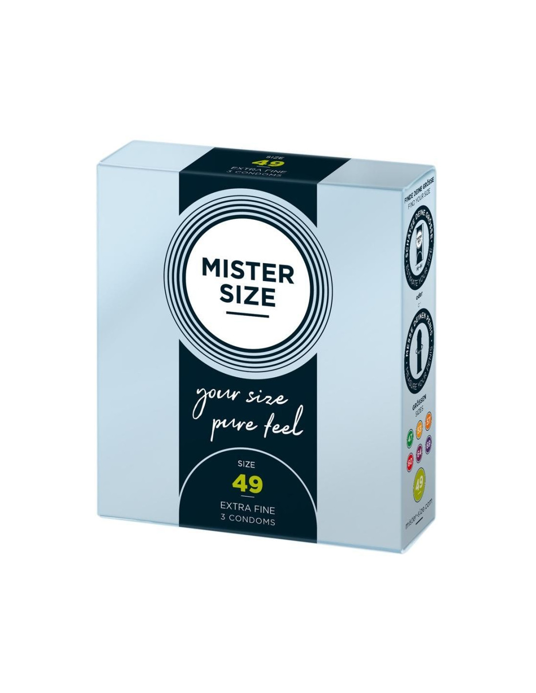 Preservativi Mister Size trasparenti e sottili (49 mm) in lattice di gomma naturale con rivestimento lubrificante e serbatoio. Vegani.