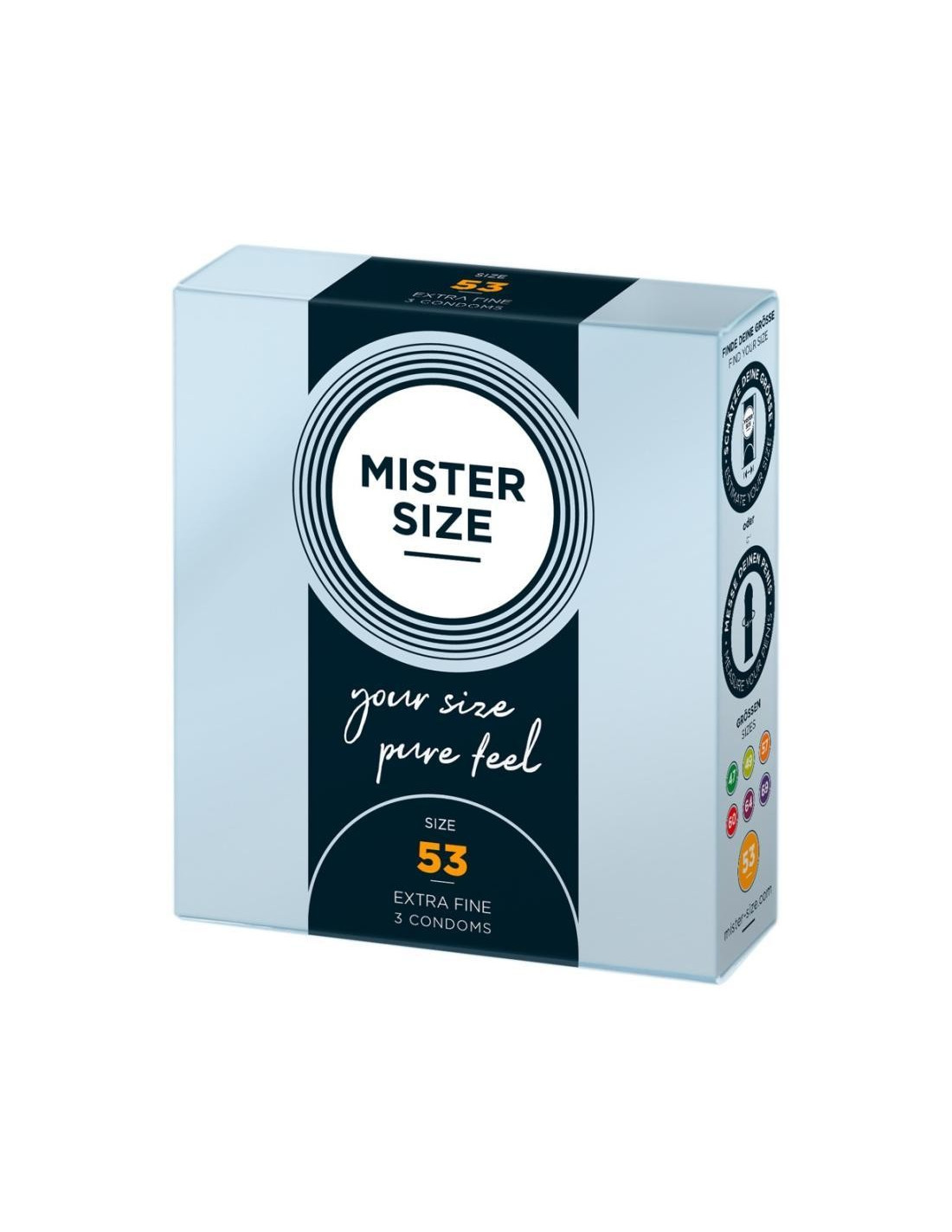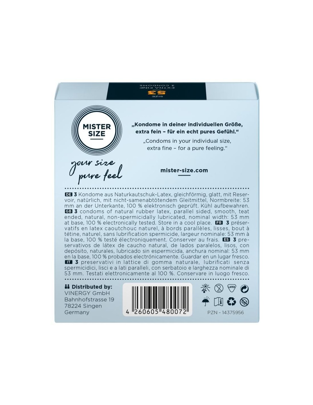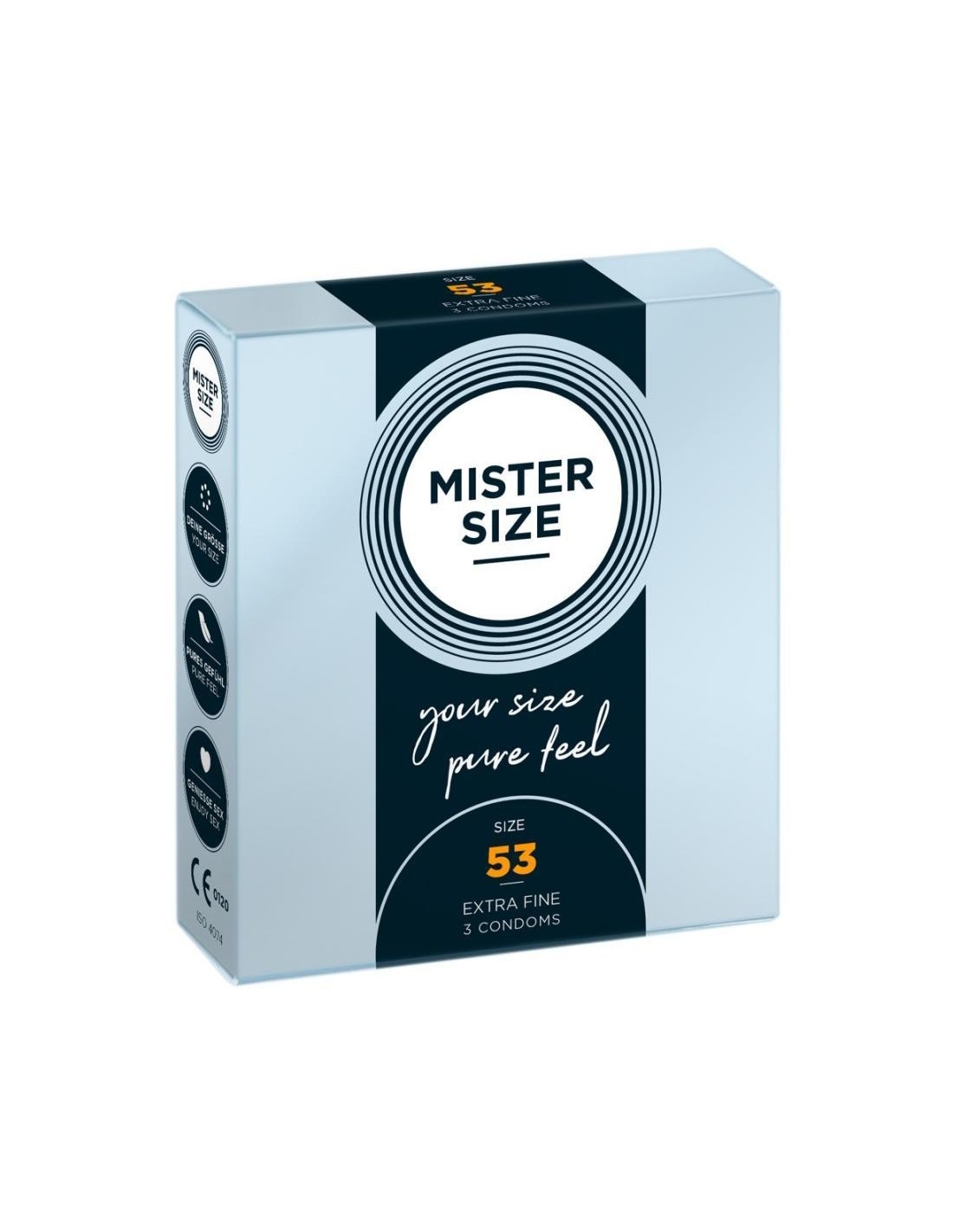 Preservativi Mister Size trasparenti e sottili (53 mm) in lattice di gomma naturale con rivestimento lubrificante e serbatoio. Vegani.