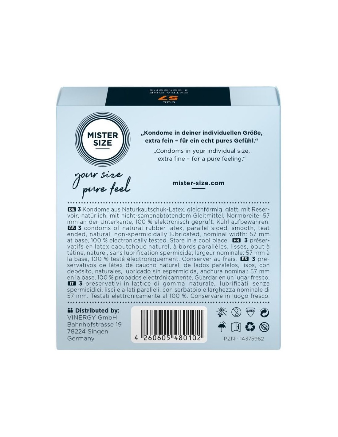 Sul fronte della confezione, la larghezza della barra centrale blu scuro può essere utilizzata per stimare la giusta dimensione del preservativo per il pene. La misura 57 mm è adatta a una circonferenza del pene compresa tra 12 e 13,5 cm.