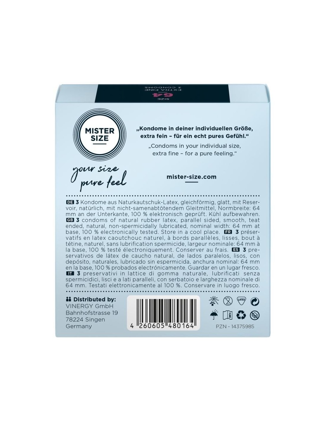 Sul fronte della confezione, la larghezza della barra centrale blu scuro può essere utilizzata per stimare la giusta dimensione del preservativo per il pene. La misura 64 mm è adatta a una circonferenza del pene compresa tra 14,5 e 15,5 cm.