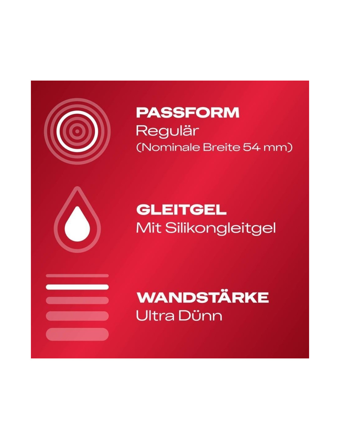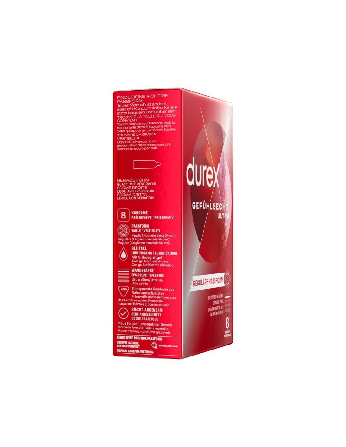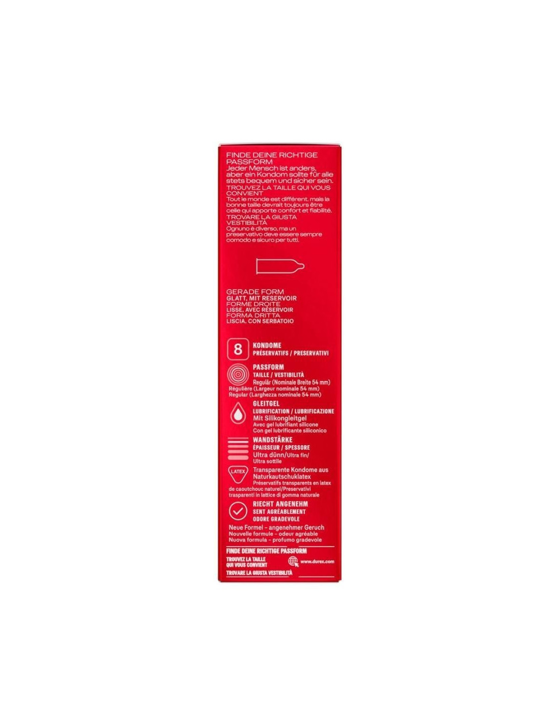Preservativi trasparenti Durex Gefühlsecht Ultra in lattice di gomma naturale con materiale più sottile del 20% sulla punta per una sensazione particolarmente intensa. Con serbatoio e rivestimento idratante a base di silicone. lunghezza 205 mm, larghezza nominale 54 mm.
